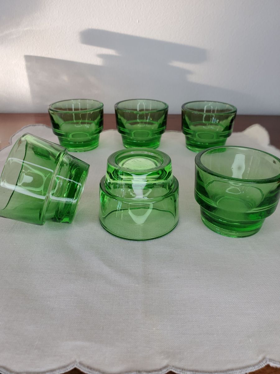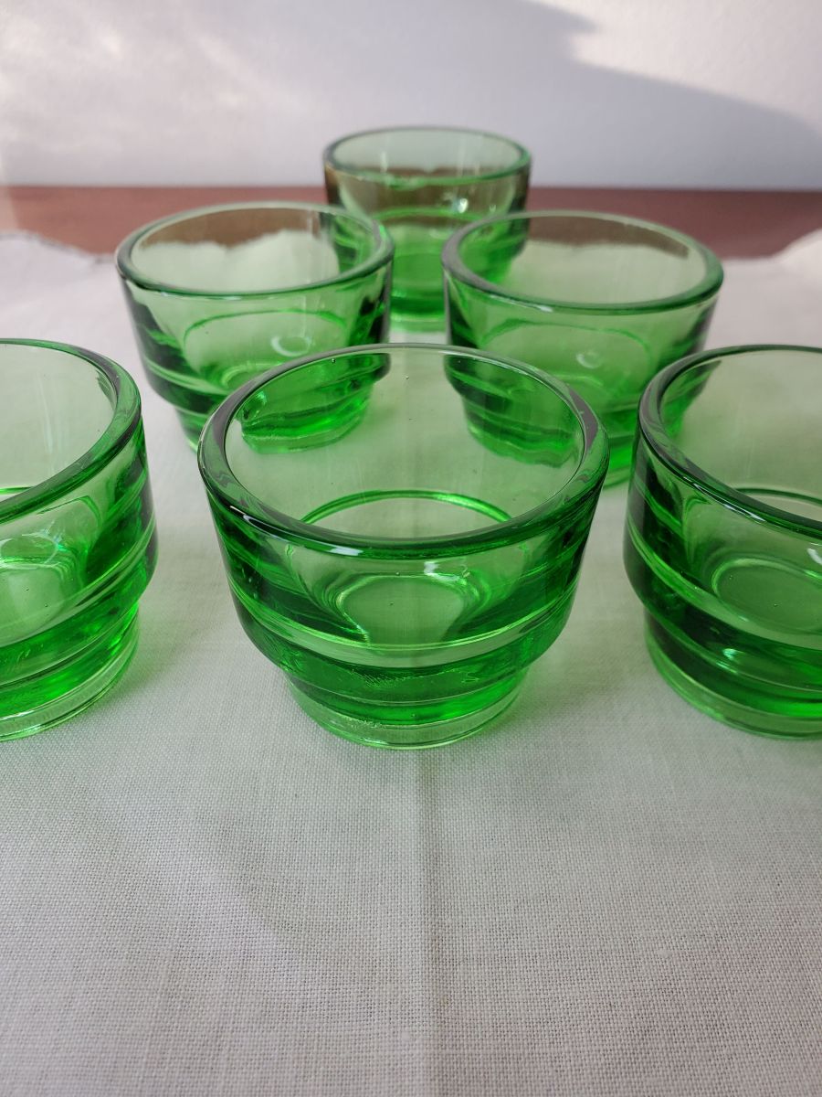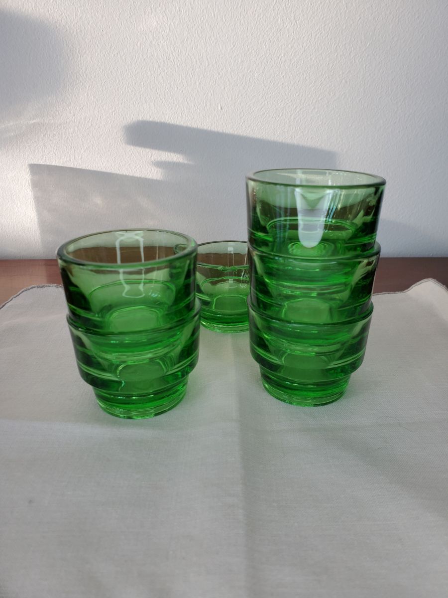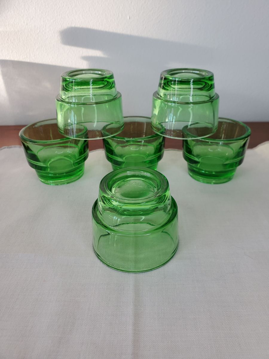 5 petits verres à liqueur empilables en verre de couleur verte, de marque LEVER.