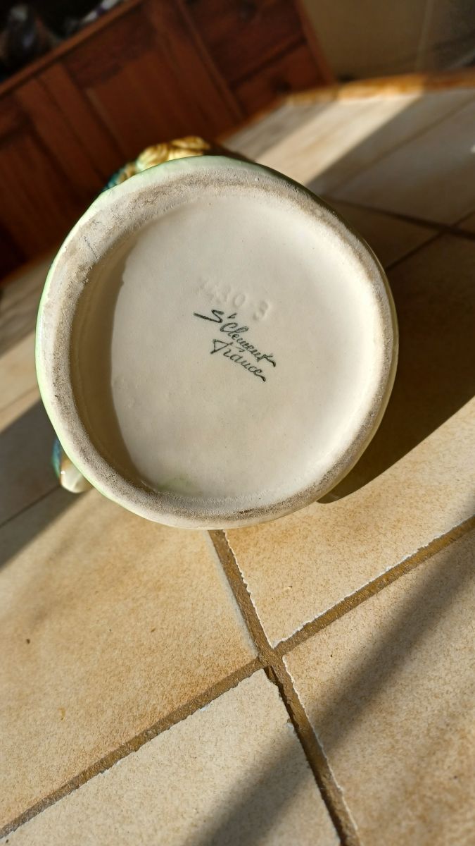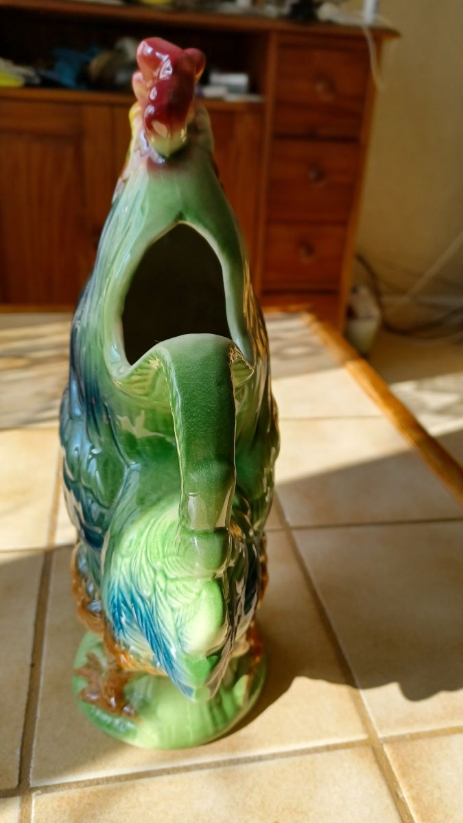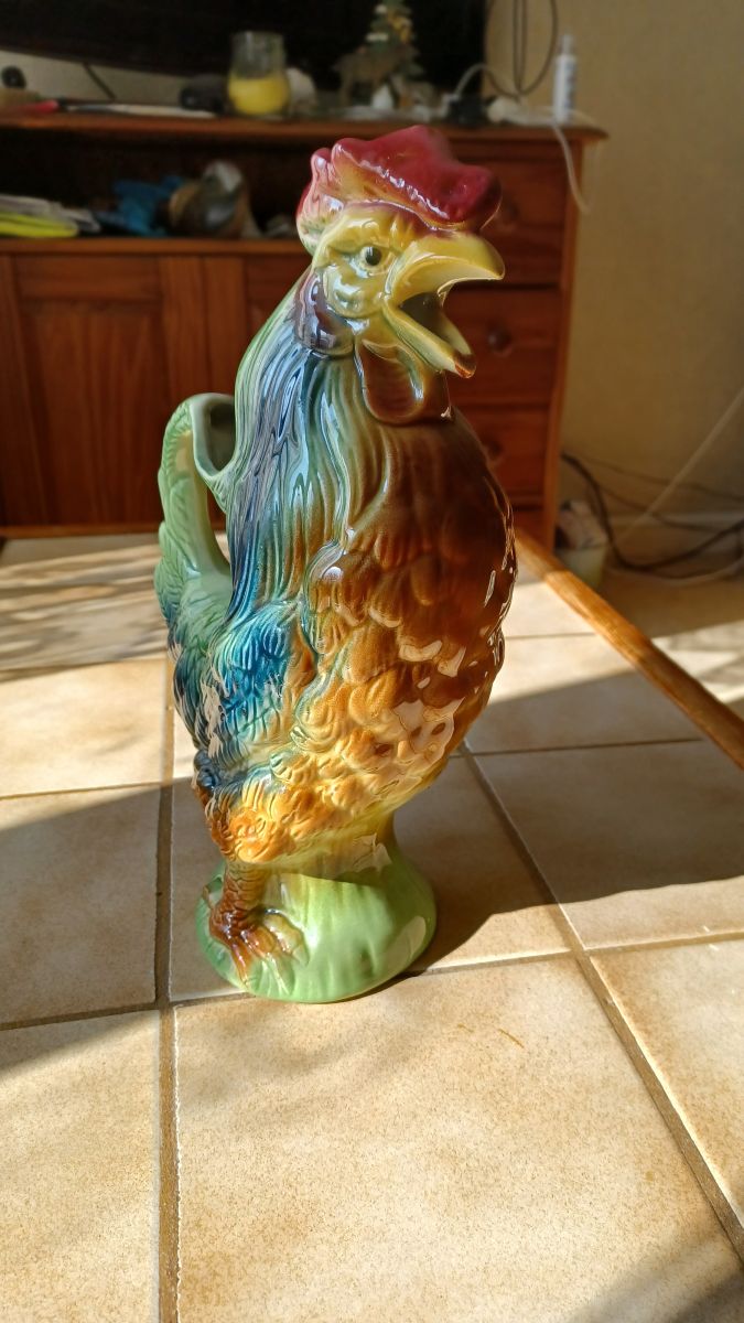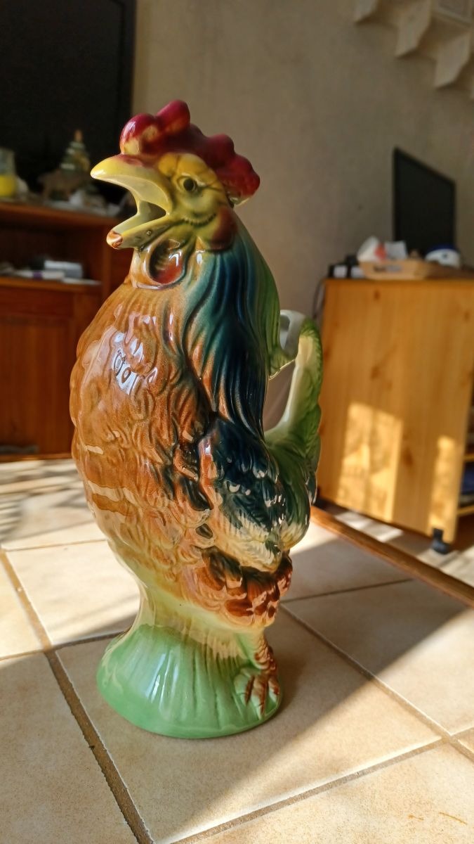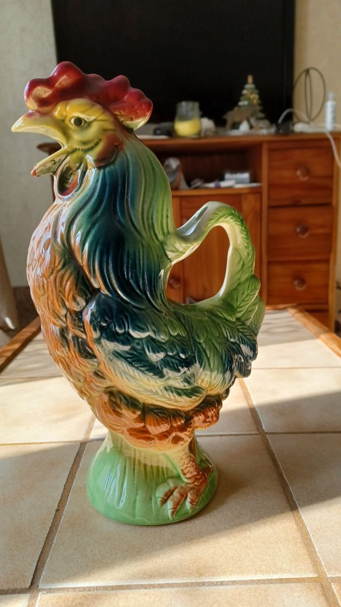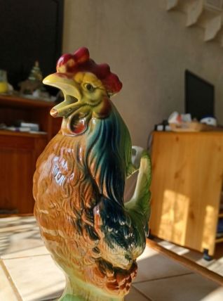 Joli pichet "le cocq" en céramique barbotine de St Clément. Les détails et les couleurs chatoyantes en font une vraie petite œuvre d'art déco, utile et utilisable qui plus est!
