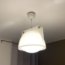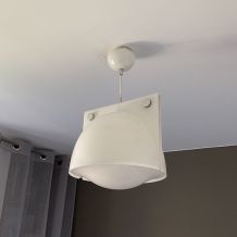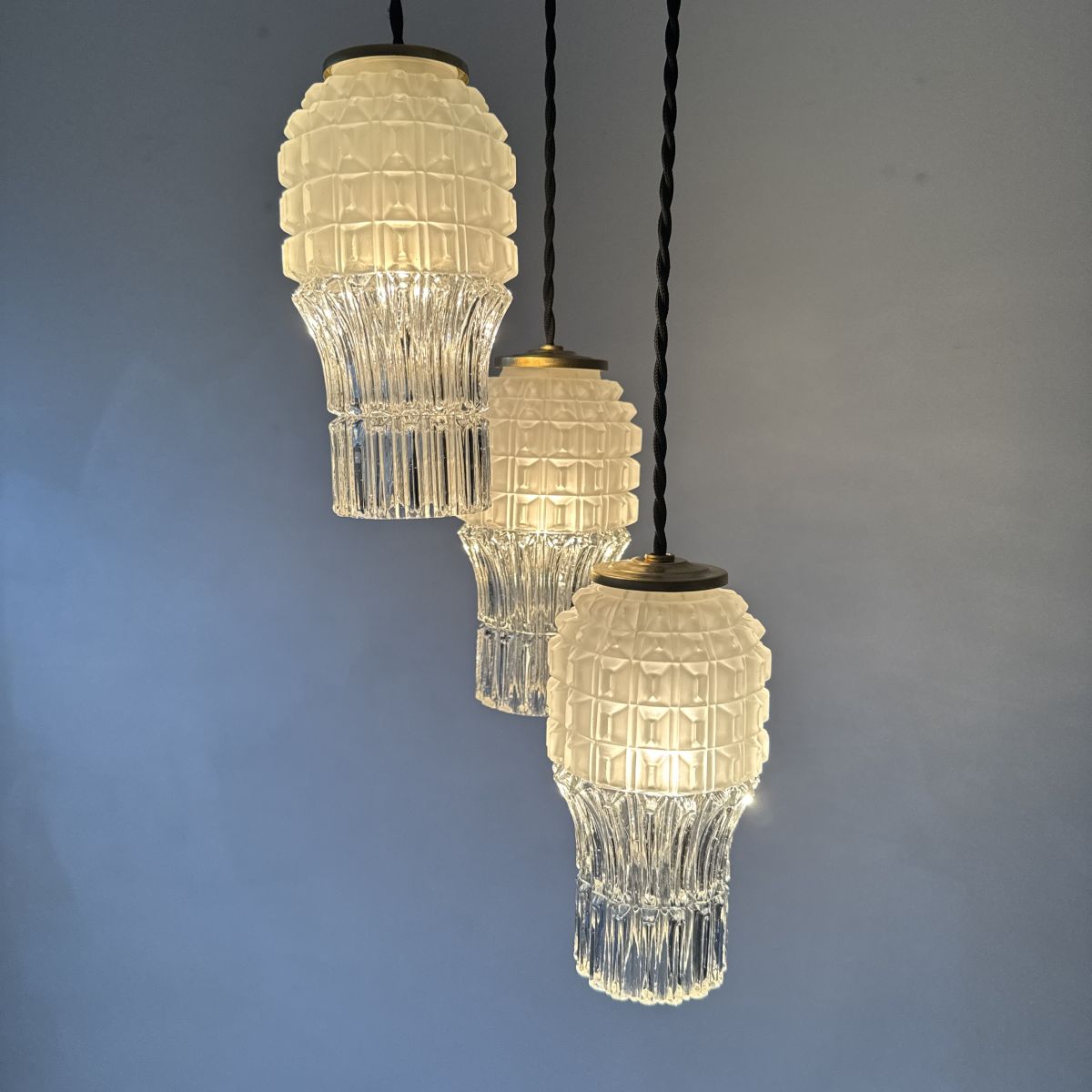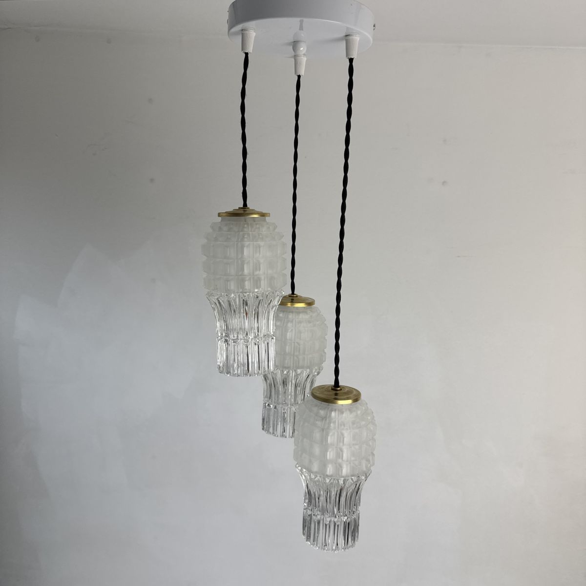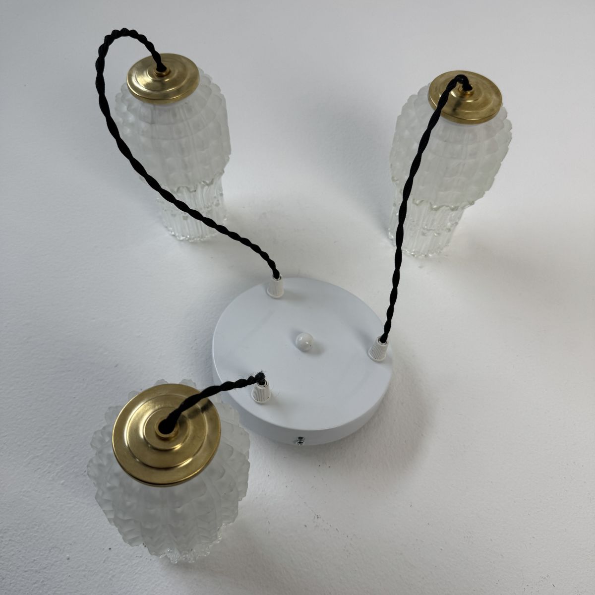 Lustre vintage 3 feux. Abat-jours en verre moulé des années 1960. Lumière tout en douceur.