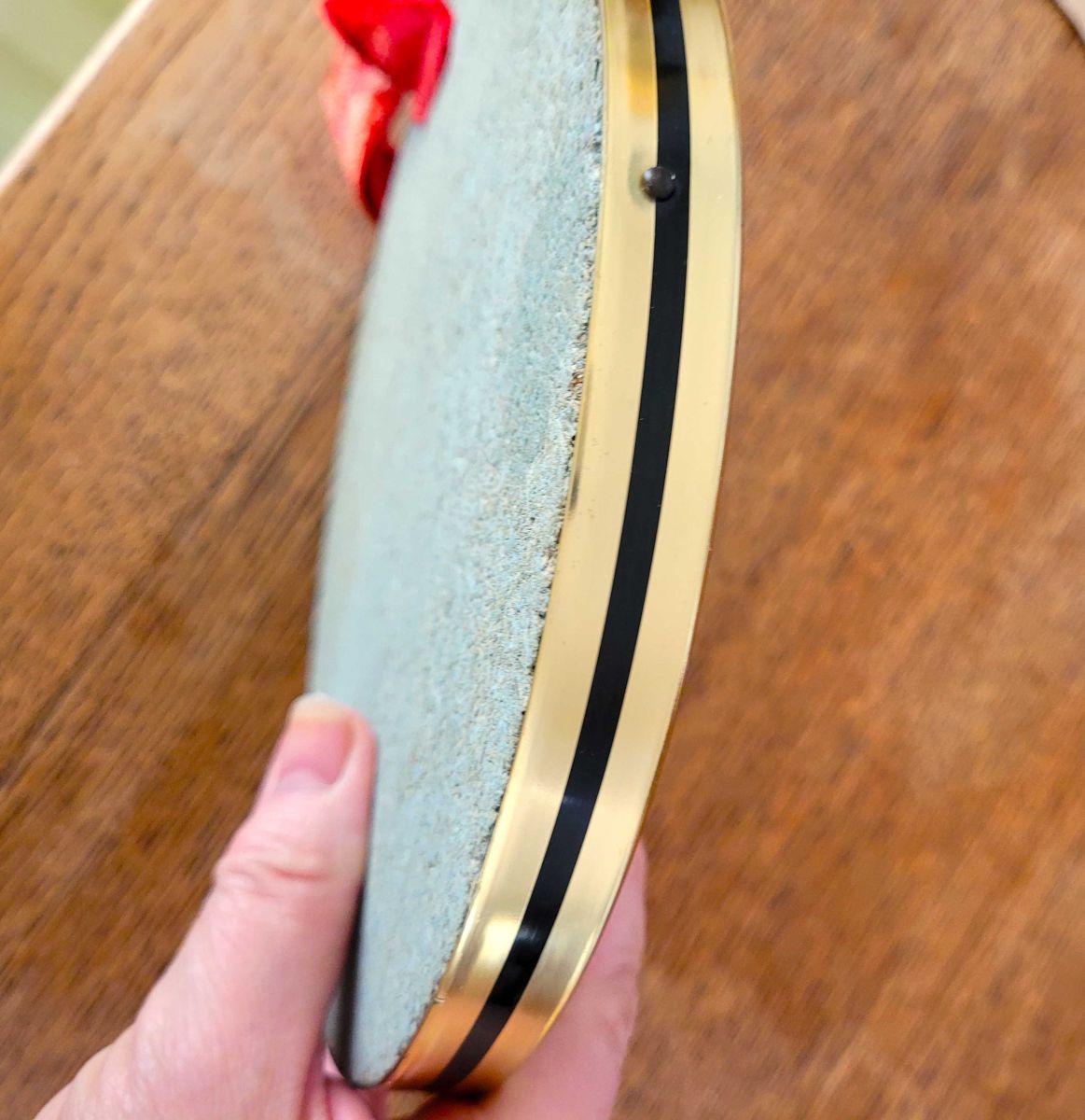 Vitre, entourage acier et fond bois en parfait état. Le ruban en velours doit être consolidé.