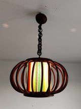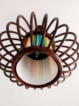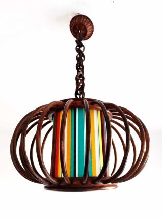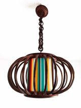 Grande suspension ronde en rotin vintage, composée d'un cylindre intérieur à l'intérieur duquel a été placé un abat-jour sur mesure avec un tissu à motifs de rayures colorées, le tout couronné par une ronde de brins de rotin arrondis.