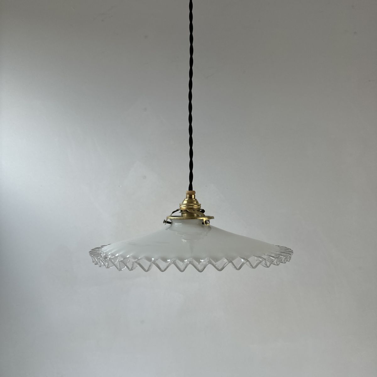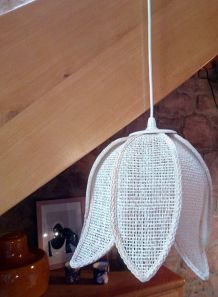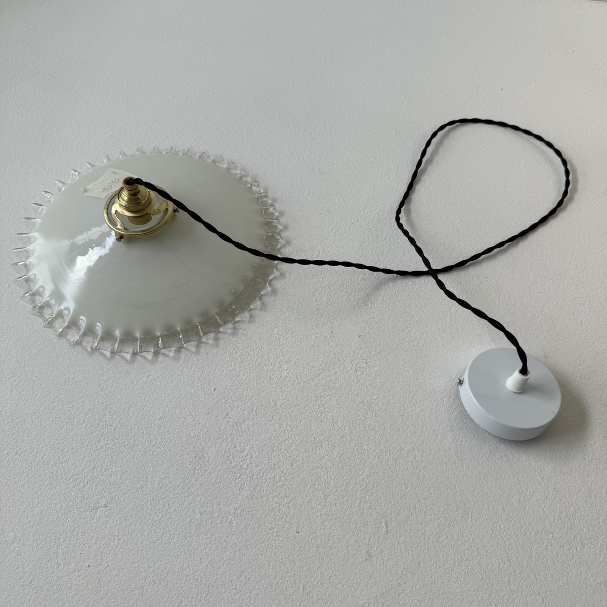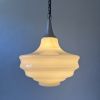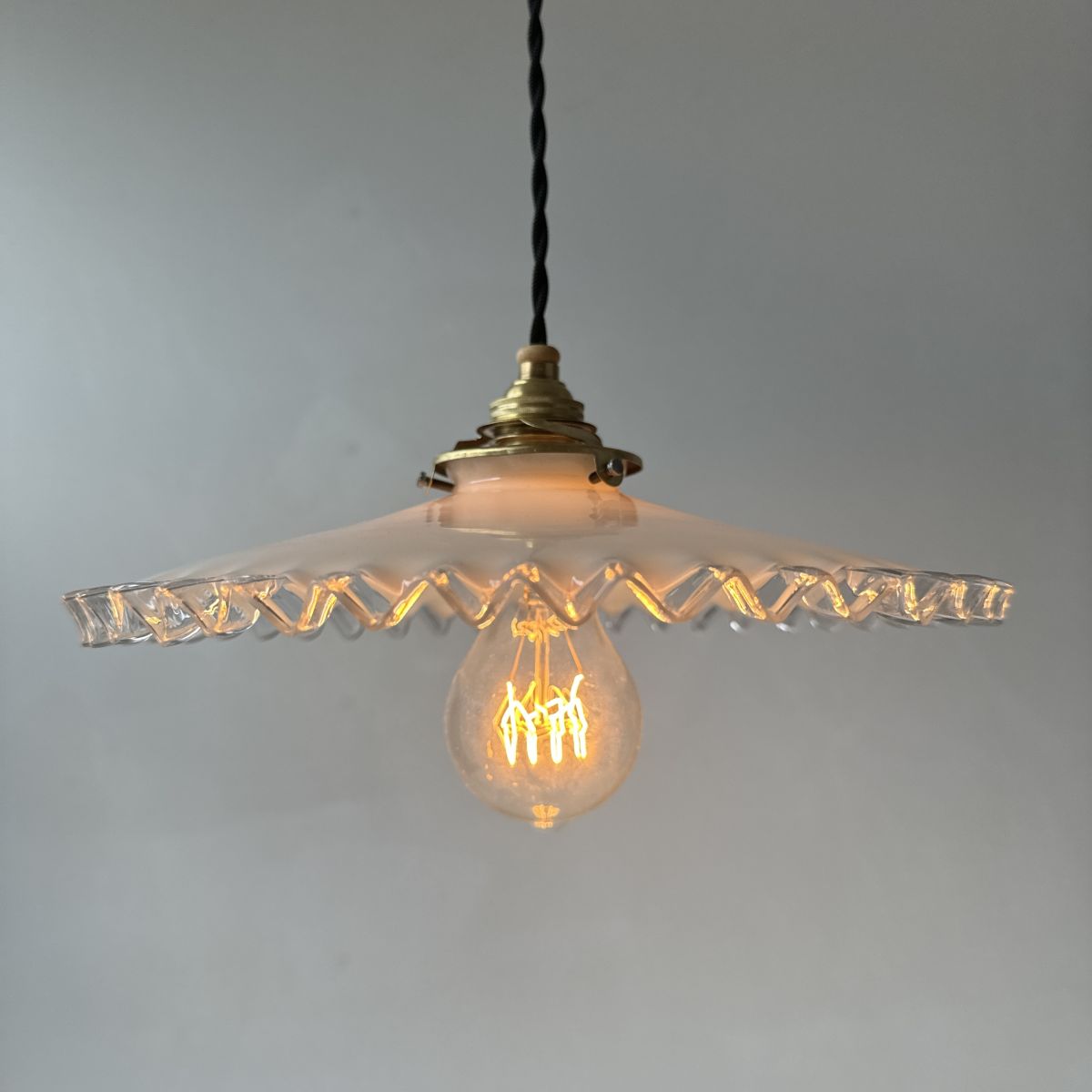 Ancienne suspension vintage en opaline dentelée. Belle lumière. Quelques traces du temps.