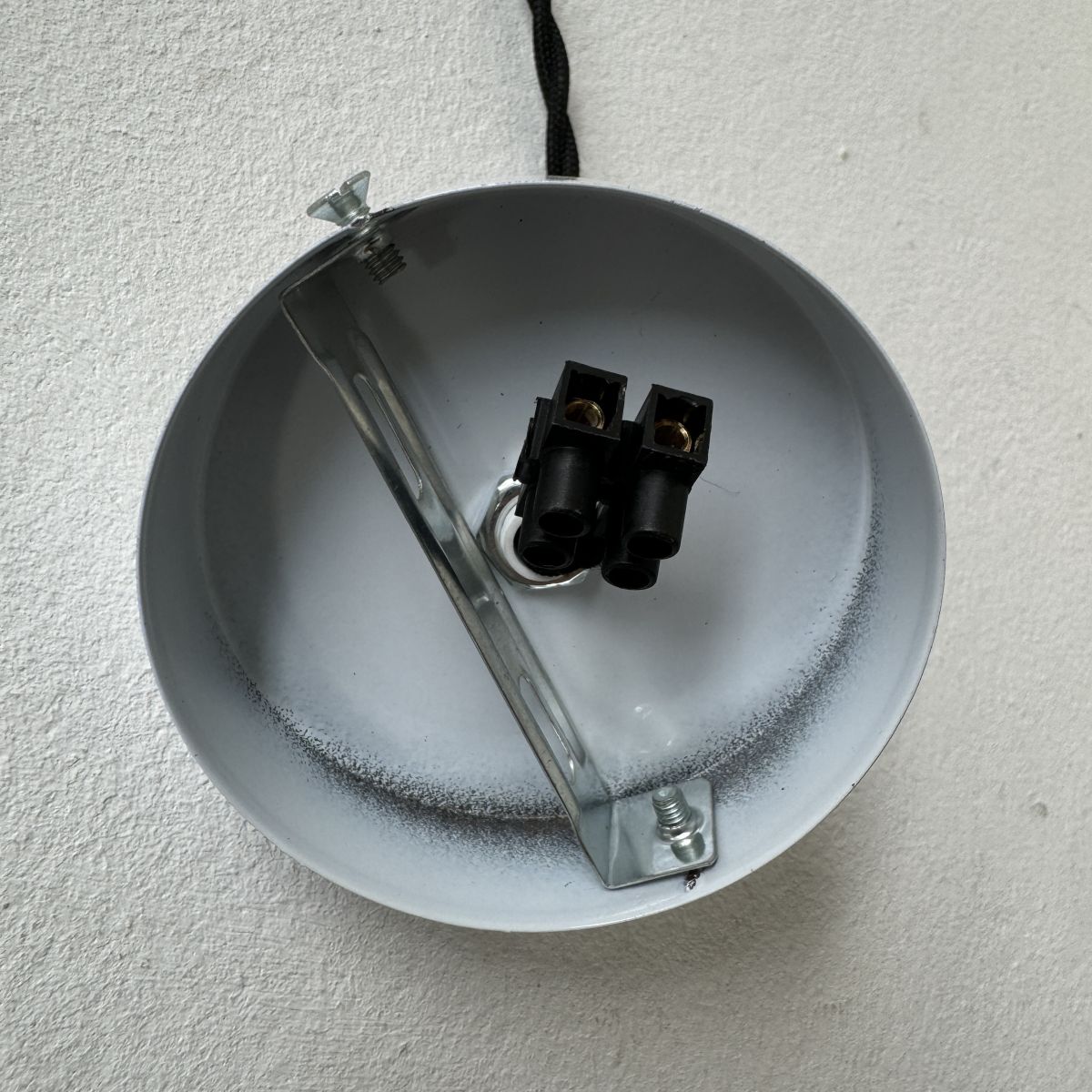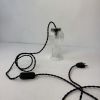 Electricité neuve avec fil noir en tissu torsadé. Prête à brancher par domino. Douille à baïonnette (ampoule B22) et rosace de fixation en métal.