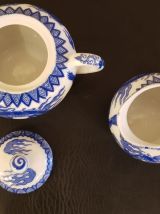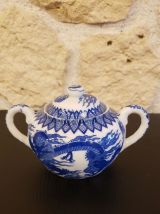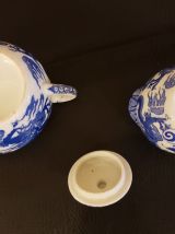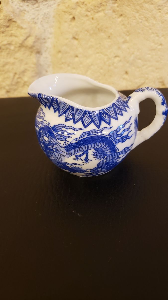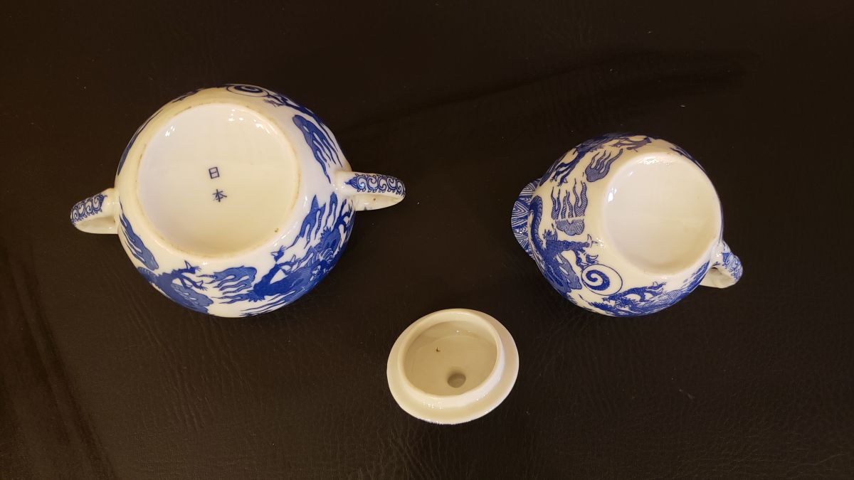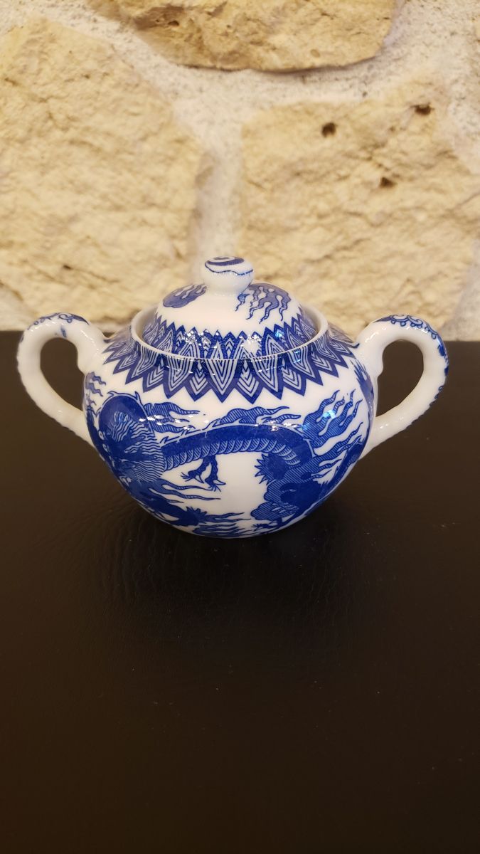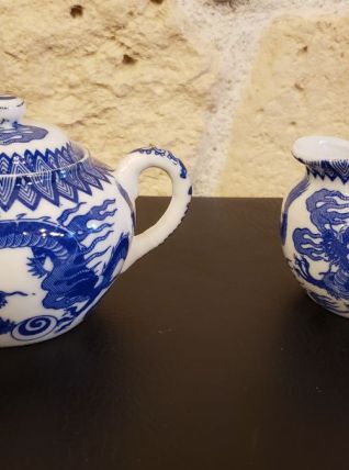 Magnifique duo composé d'une théière (ou sucrier) double anse avec couvercle et d'un pichet assorti, tous deux décorés de motifs traditionnels de dragons bleus.