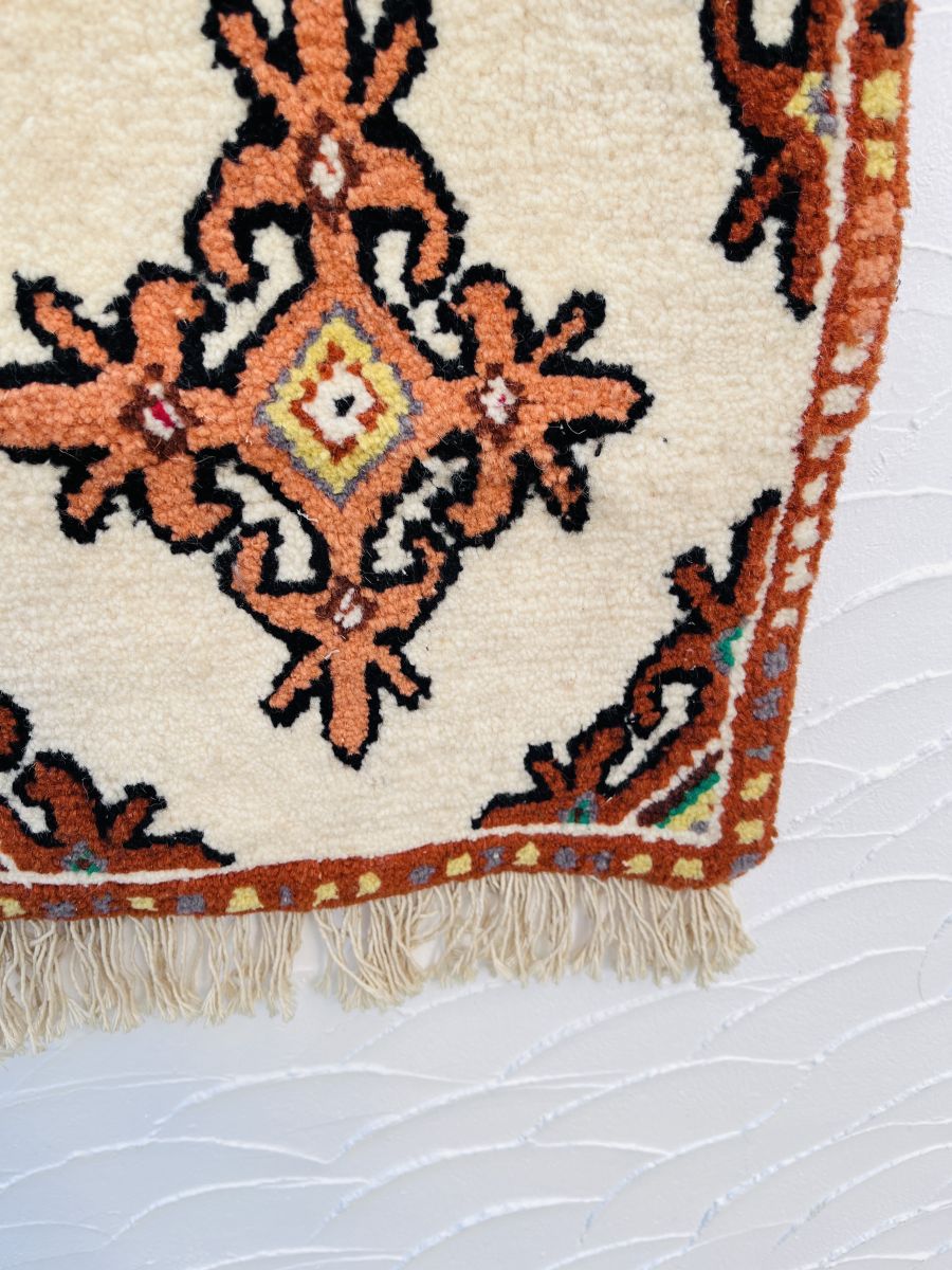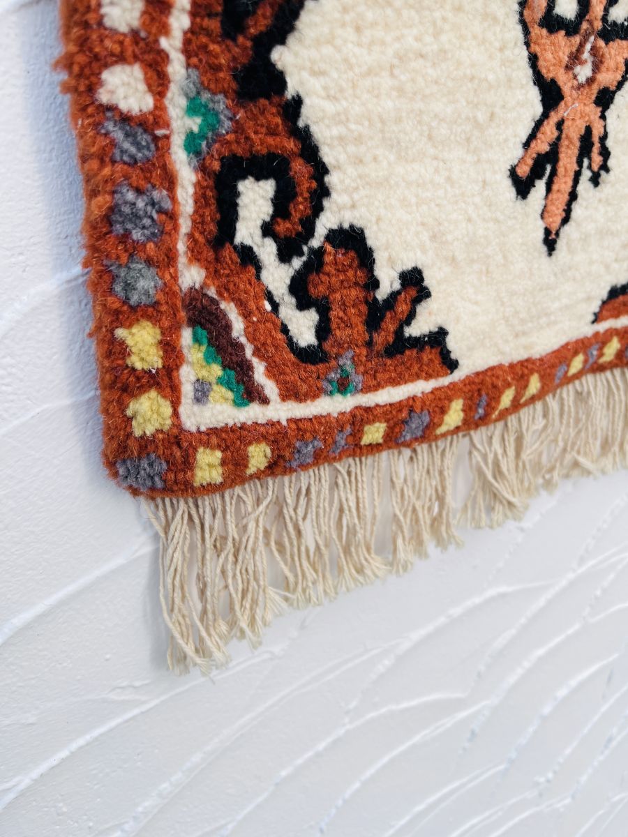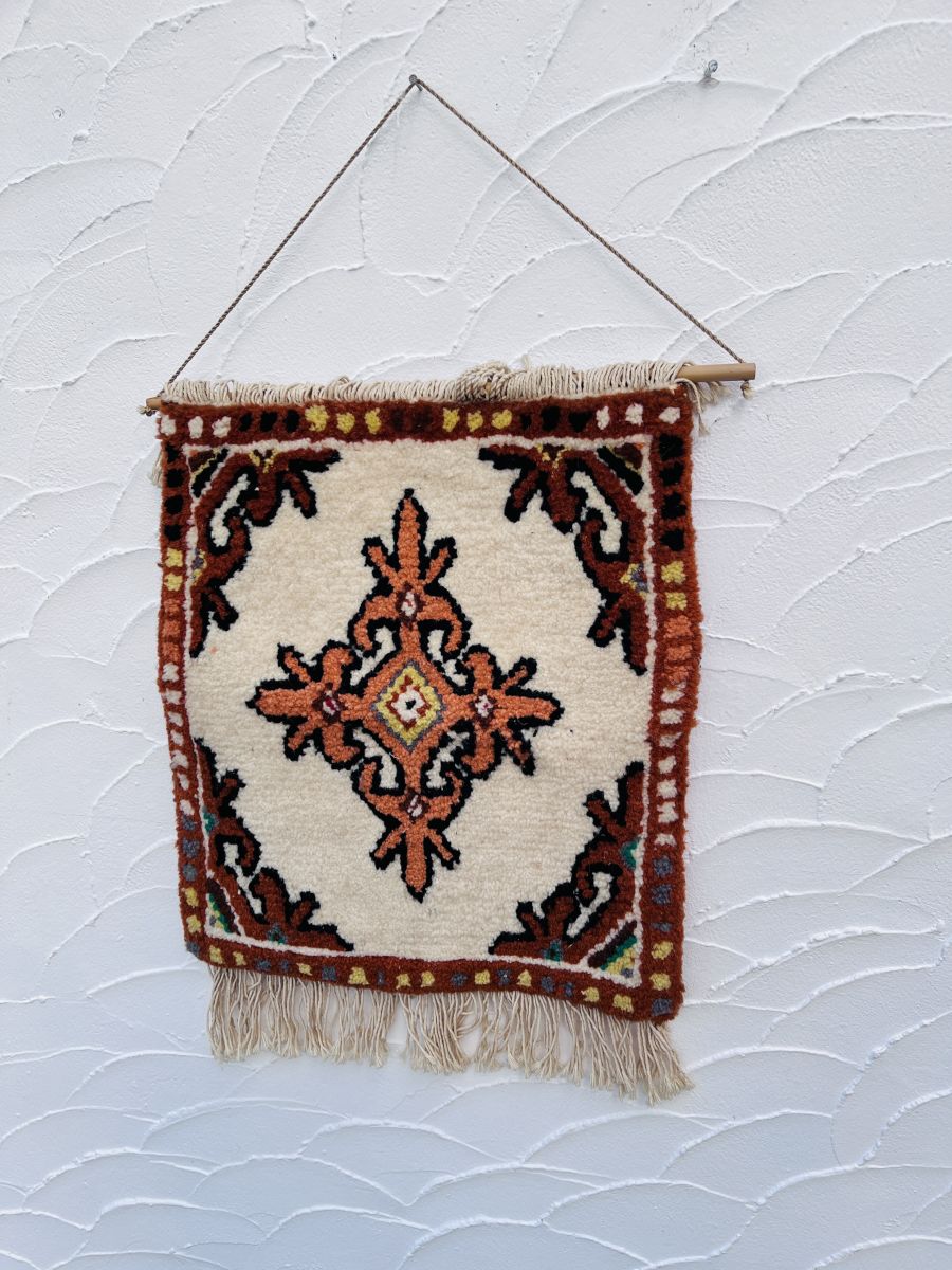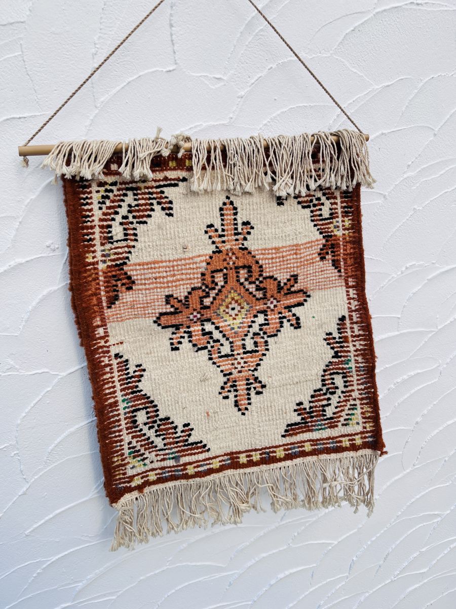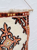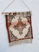 Jolie tapisserie vintage en laine avec des franches, montée sur un support en bambou.
