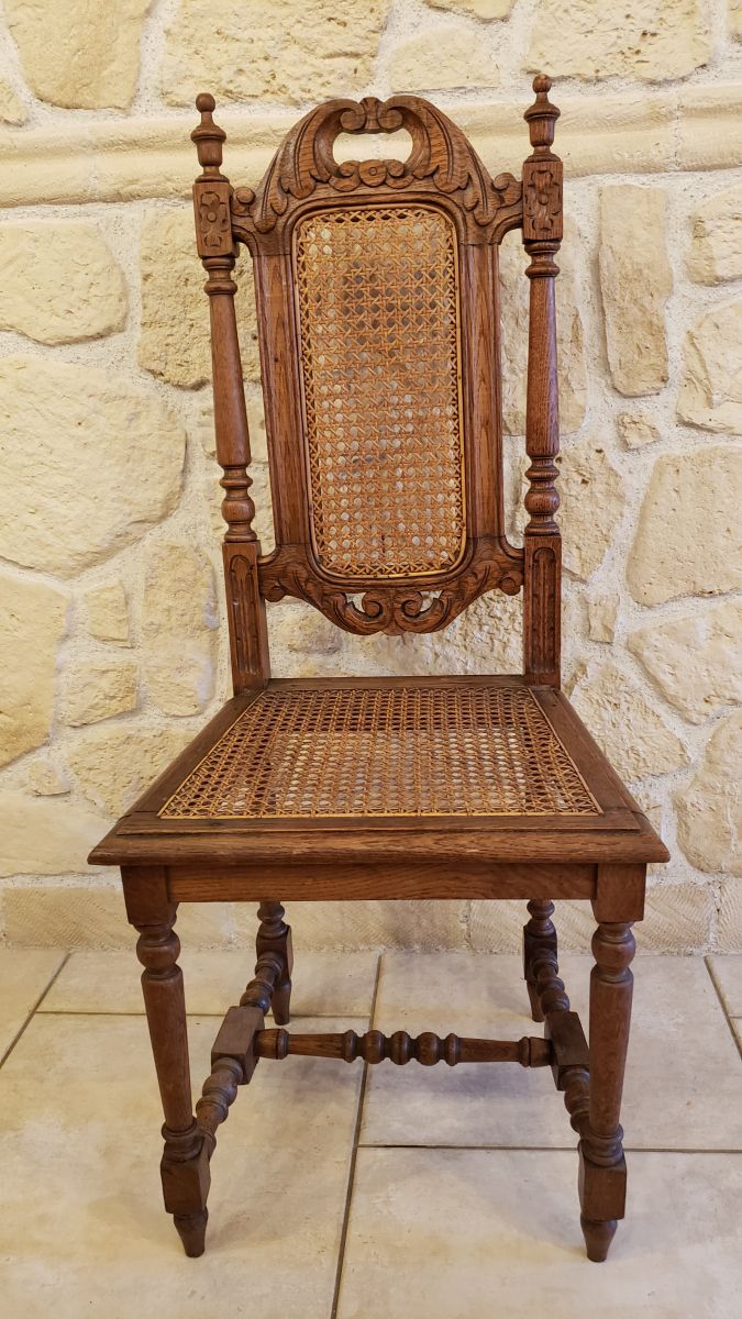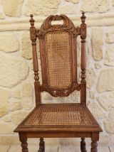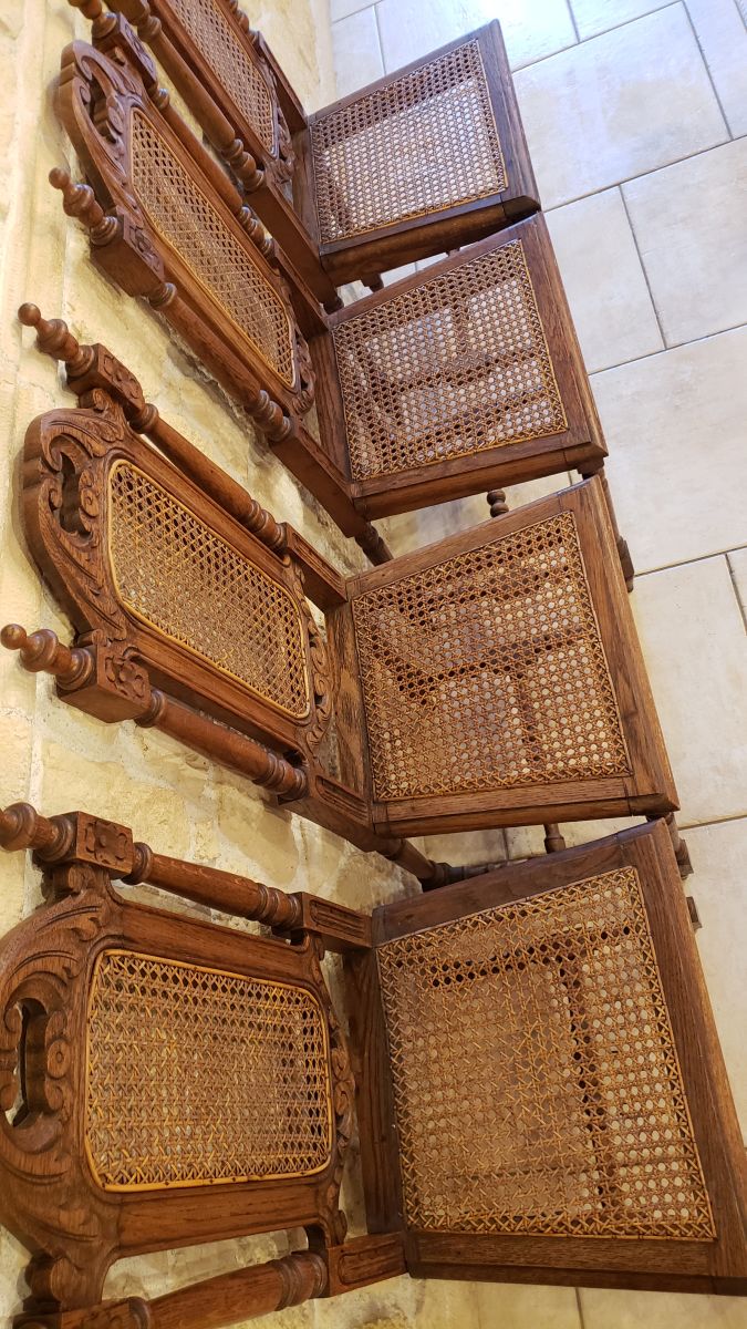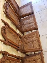 Chaque chaise est ornée de sculptures délicates et dotées d'un dossier et d'une assis en cannage, alliant charme classique et confort.