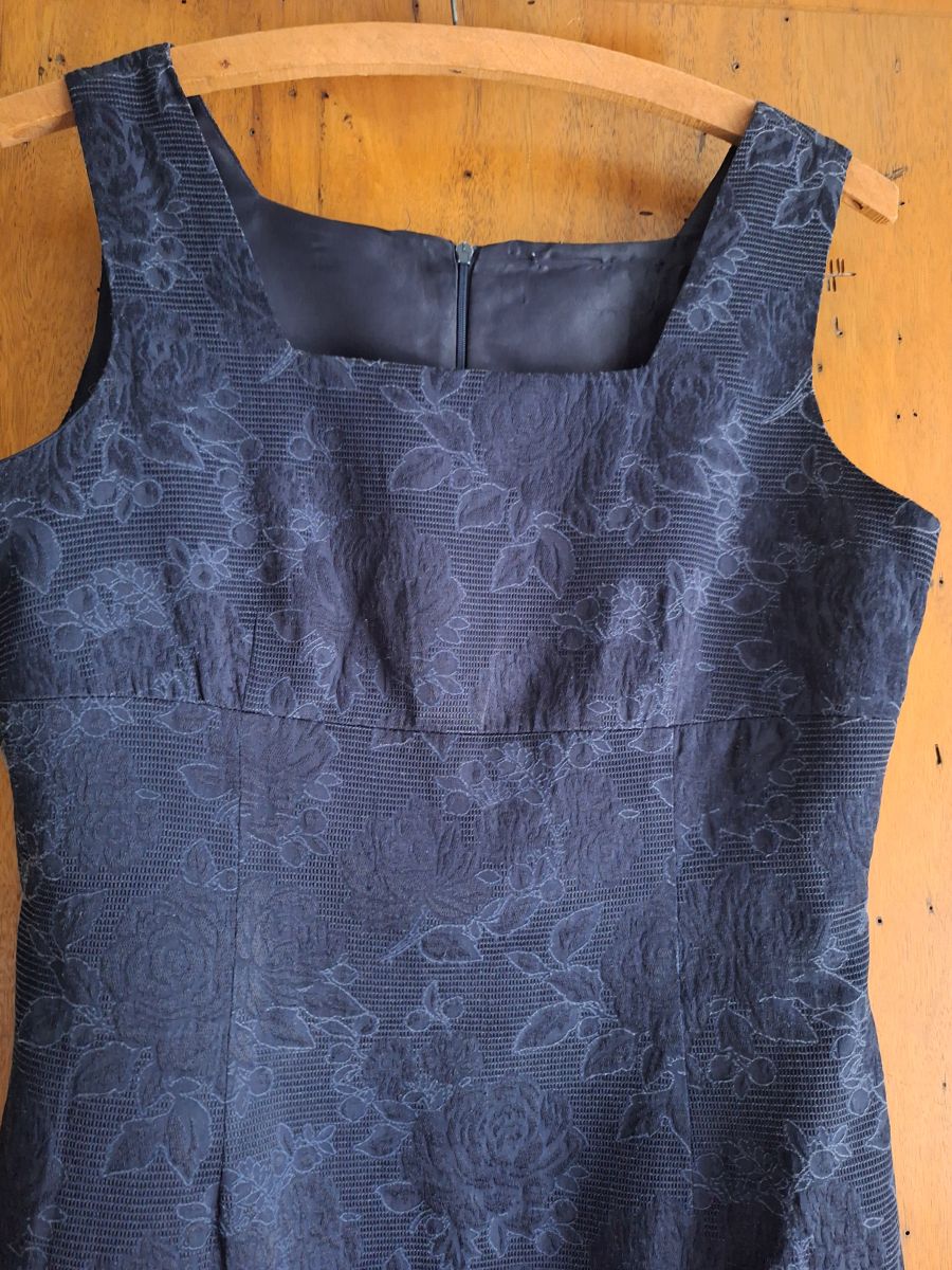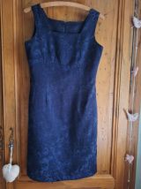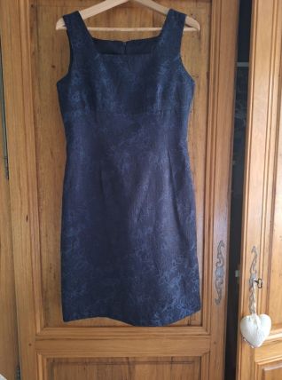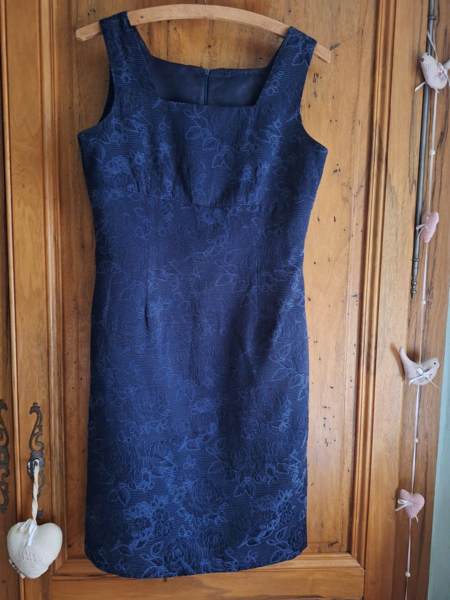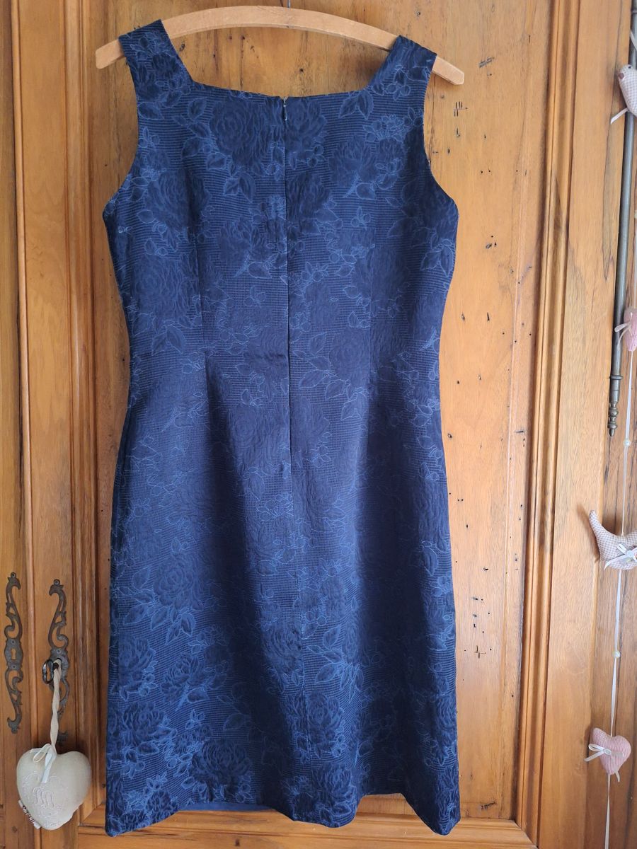 Robe élégante de couleur bleu foncé avec un tissu texturé et des motifs floraux en relief
