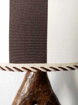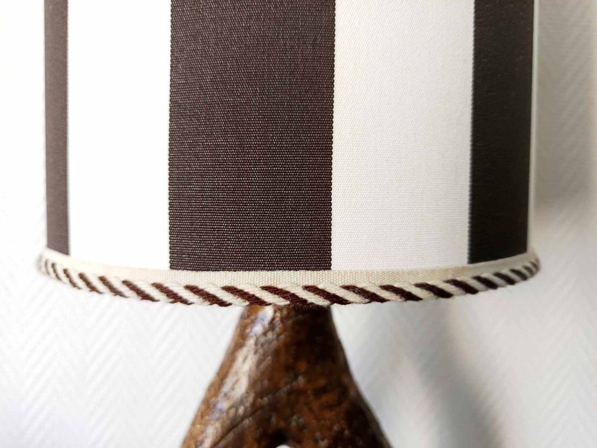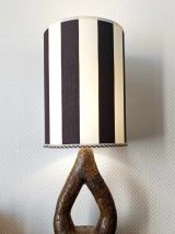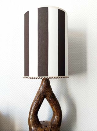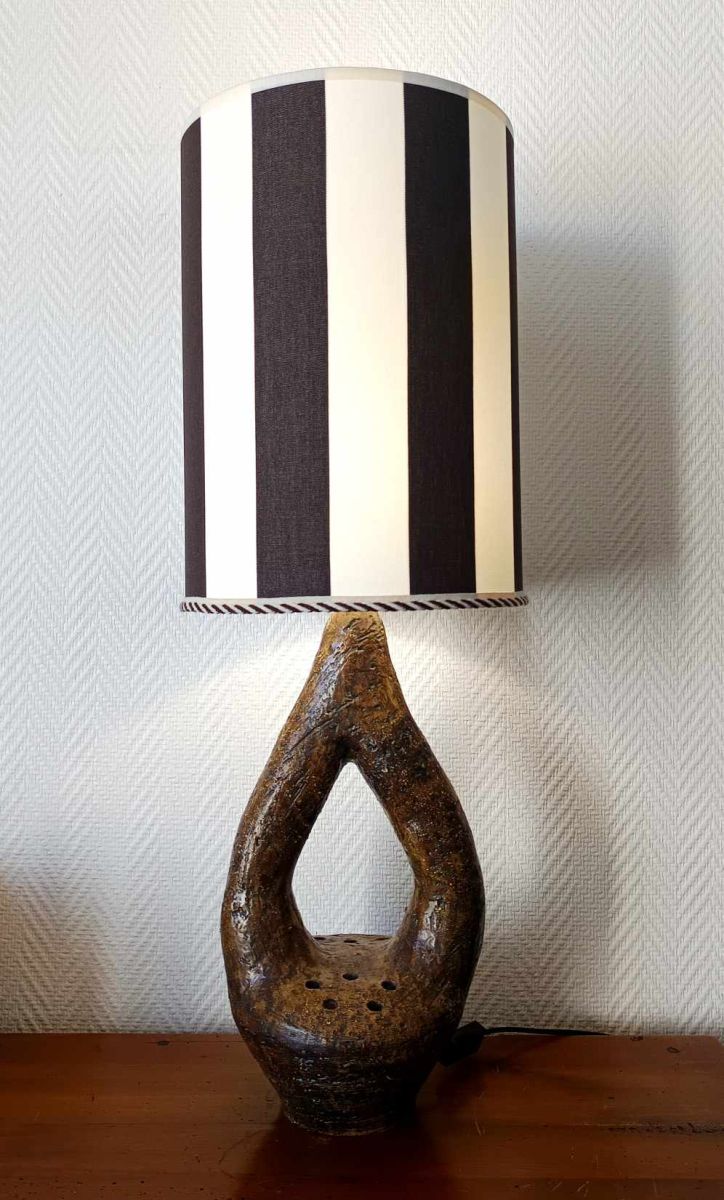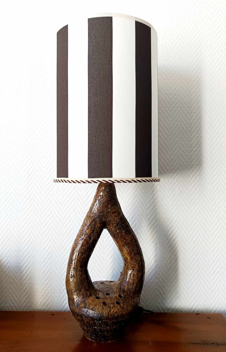 Céramique de forme libre à glaçure brune à texture brutaliste, trous percés sur le bas du pied, deux bras se rejoignant au col. Cette céramique a été montée en lampe, abat-jour a été réalisé sur mesure : de forme cylindrique avec tissu coton à rayures de couleurs blanche et brune, bordure crème sur le bord supérieure et tresse de laine blanche et brune sur le bord inférieur.