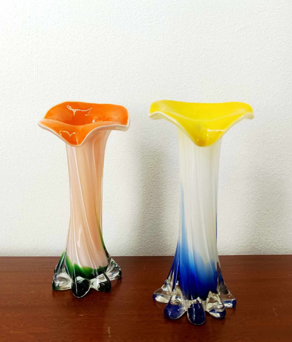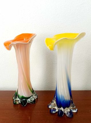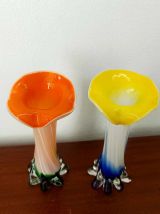 Deux vases soliflores en forme d'arum en verre plusieurs couleurs. Pied dit "patte d'éléphant"