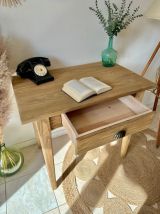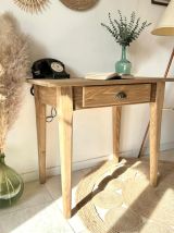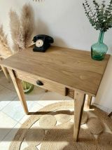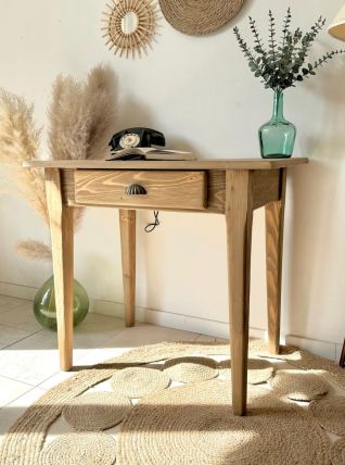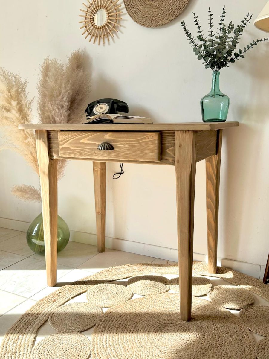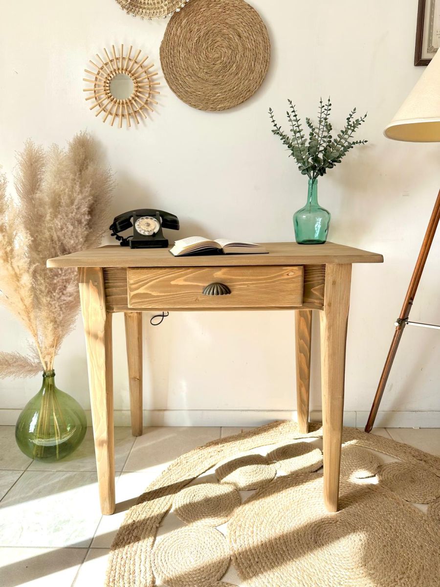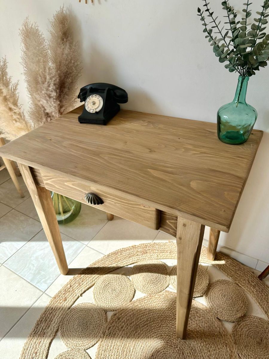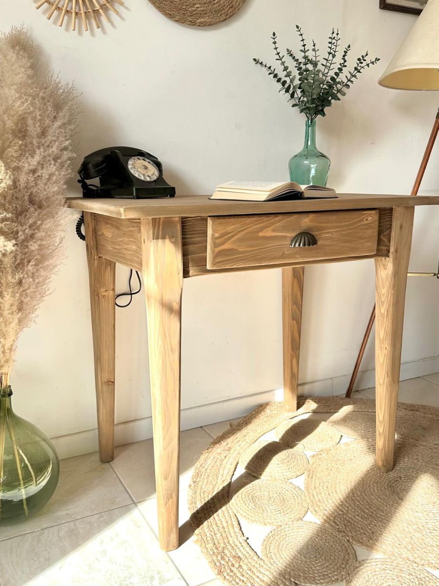 Voici Léonie, jolie table d'appoint ou bureau style table de ferme rustique. Tout en bois brut, son veinage lui apporte un charme authentique qui ne laisse pas indifférent. Comporte un tiroir sublimé par une joie poignée coquille effet brossé.