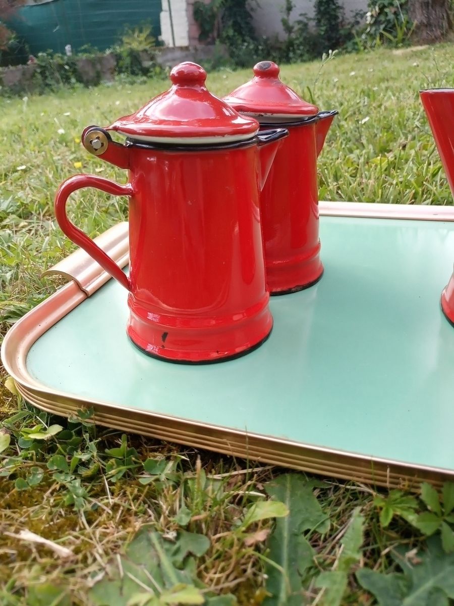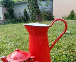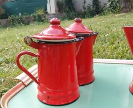 Pichet 23cm et petites théières (12 et 10cm) rouges en émail VINTAGE