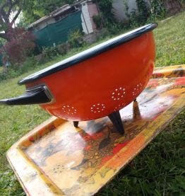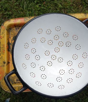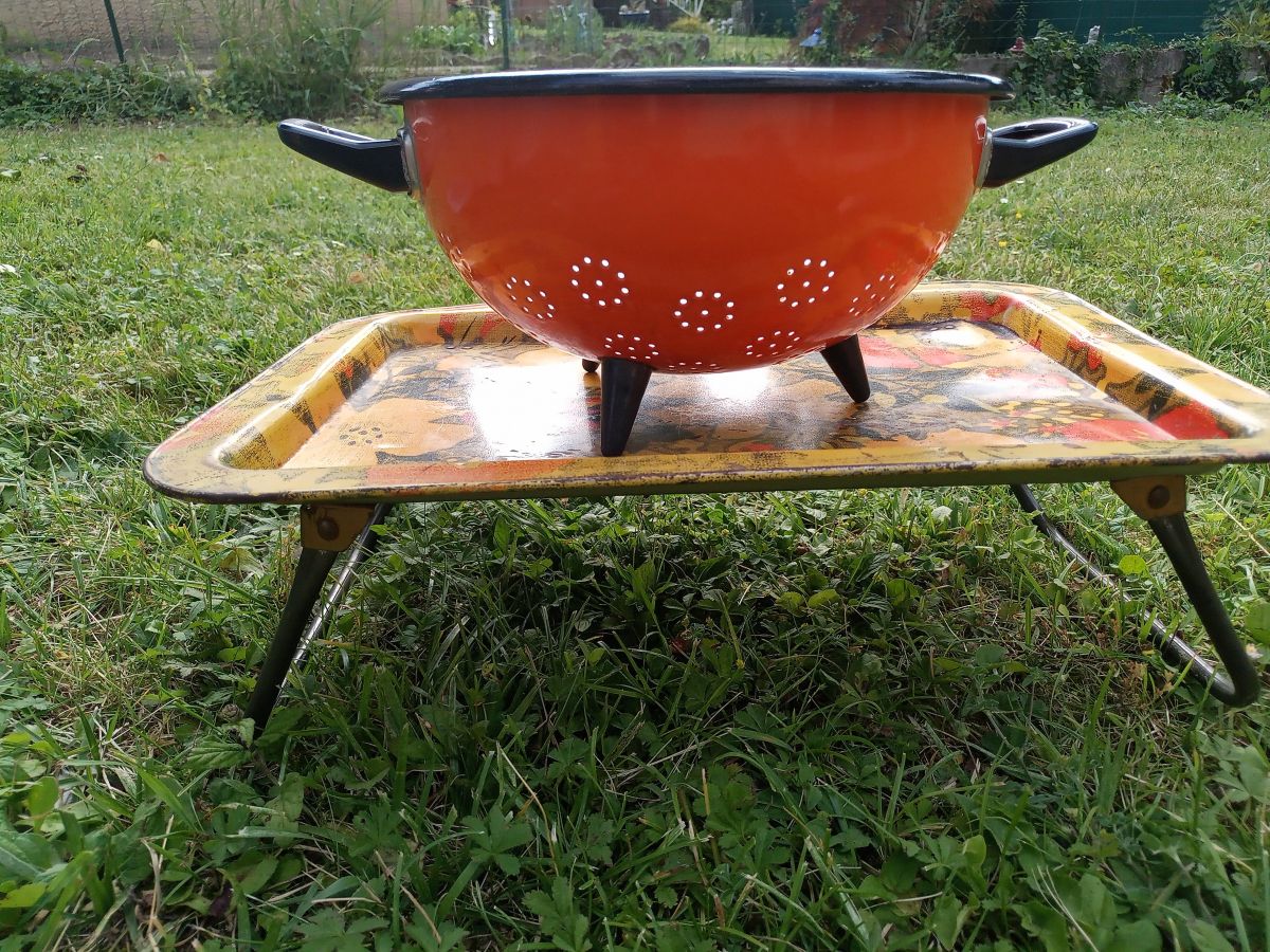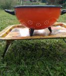 Passoire émail orange Vintage diamètre 26CM, trois pieds.