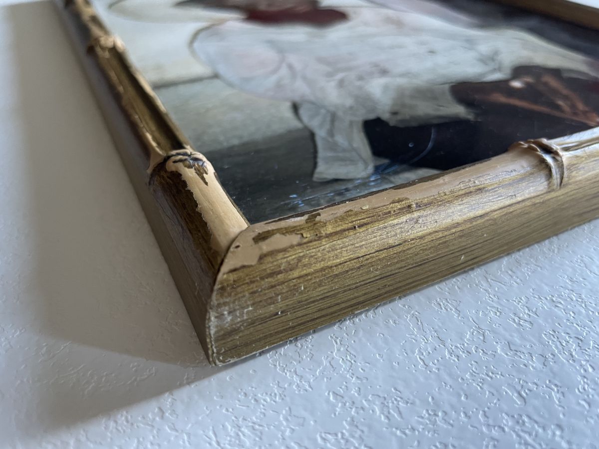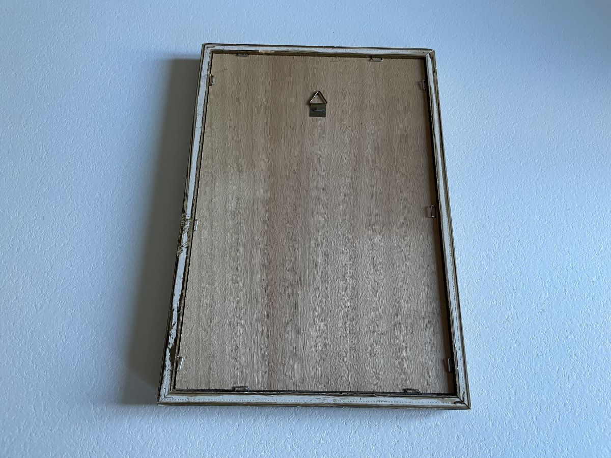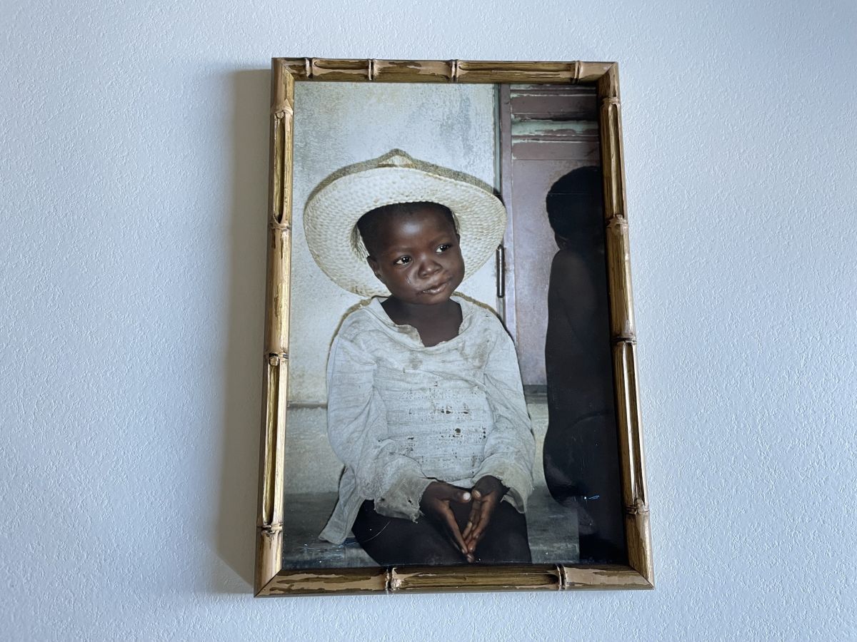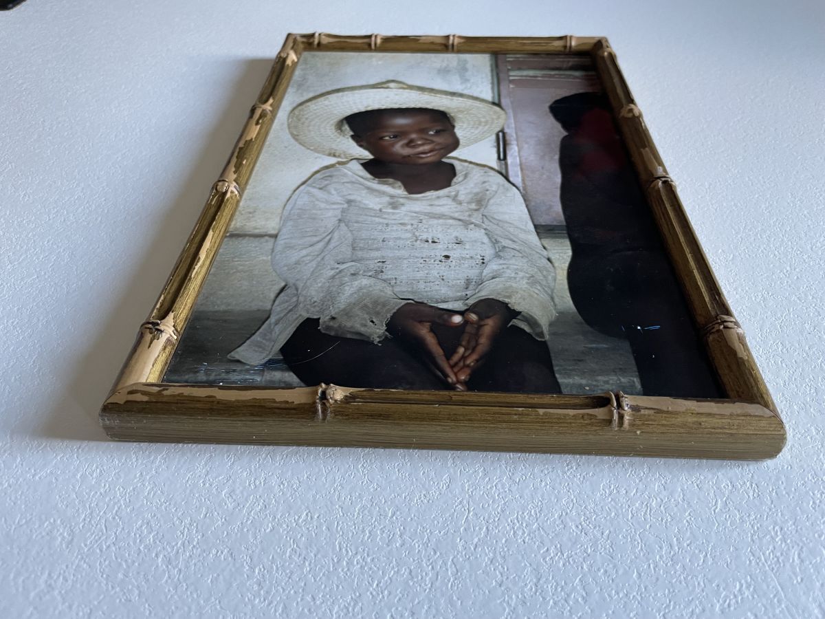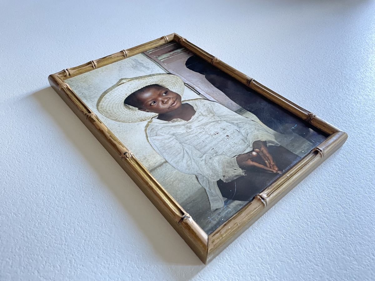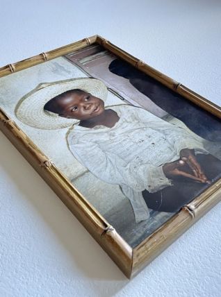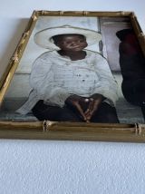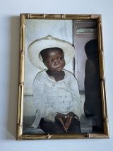 Photographie d’un petit enfant africain, encadrement en bois faux bambou, dimensions (cm) : L.22xH.32xP.2, bon état.