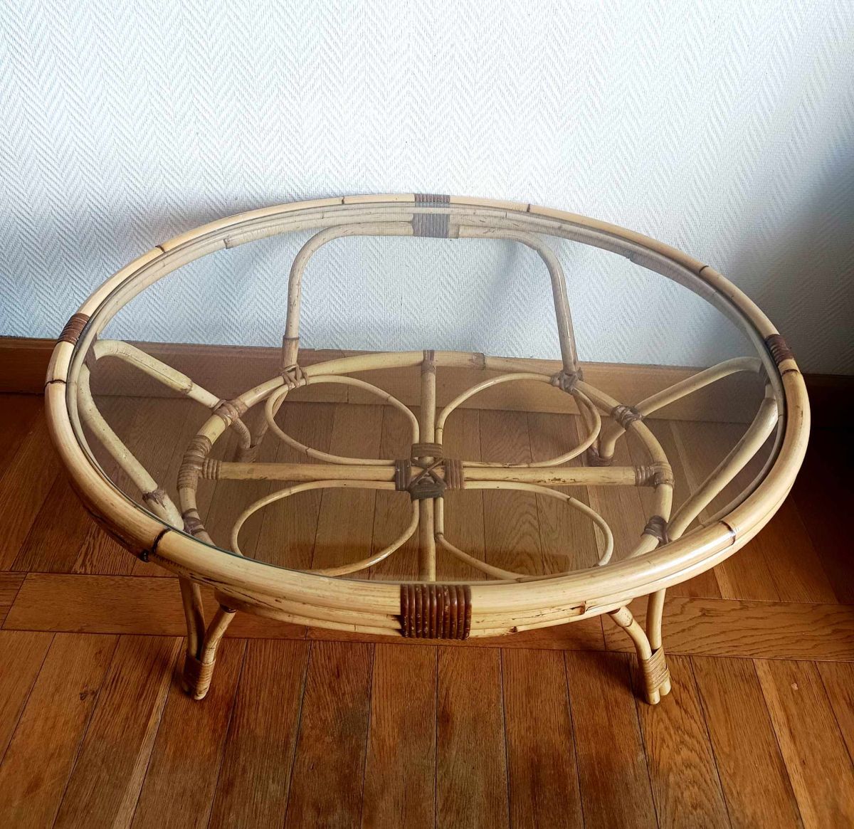 Table basse de forme ovale reposant sur quatre pieds, structure en rotin clair et lanières rotin plus foncées, plateau en verre. Entretoise formant une fleur permettant d'entreposer des revues et magazines.