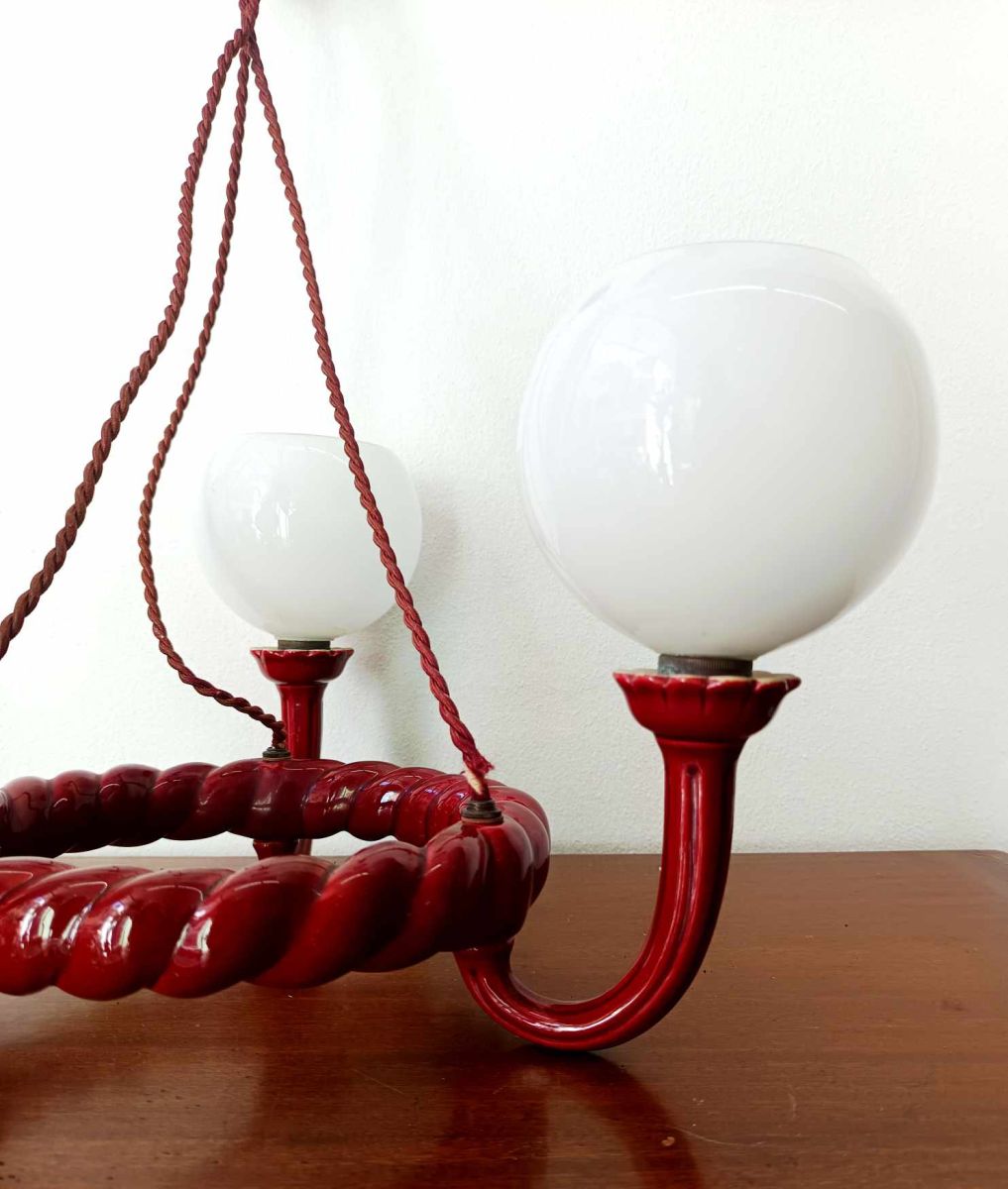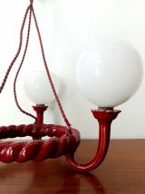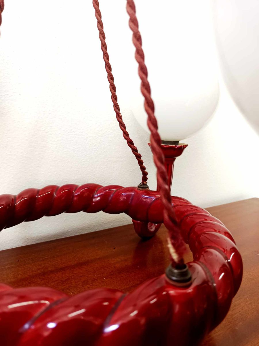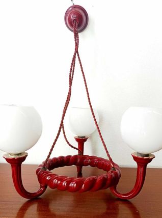 Lustre à structure ronde à trois branches en céramique tressée émaillée bordeaux. Trois globes percés en opaline blanche . Pavillon également en céramique bordeaux.