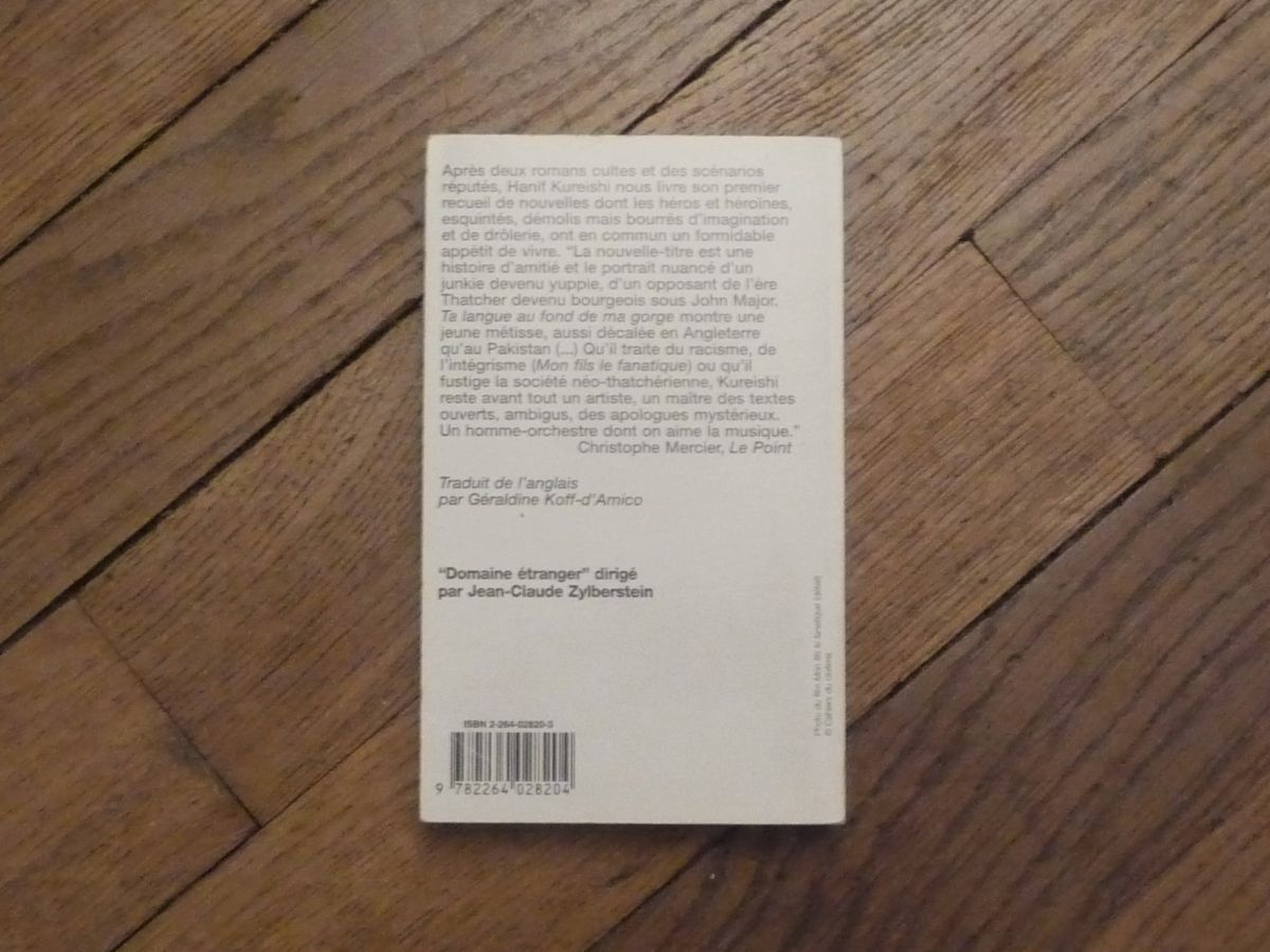 Après deux romans cultes et des scénarios réputés, Hanif Kureishi nous livre son premier recueil de nouvelles dont les héros et héroïnes, esquintés, démolis mais bourrés d'imagination et de drôlerie, ont en commun un formidable appétit de vivre. "La nouvelle titre est une histoire d'amitié et le portrait nuancé d'un junkie devenu yuppie, d'un opposant de l'ère Thatcher devenu bourgeois sous John Major. Ta langue et au fond de ma gorge montre une jeune métisse, aussi décalée en Angleterre qu'au Pakistan (...) Qu'il traite du racisme, de l'intégrisme (Mon fils le fanatique) ou qu'il fustige la société néo thatchérienne, Kureishi reste avant tout un artiste, un maître des textes ouverts, ambigus, des apologues mystérieux. Un homme orchestre dont on aime la musique" Christophe Mercier, Le Point.