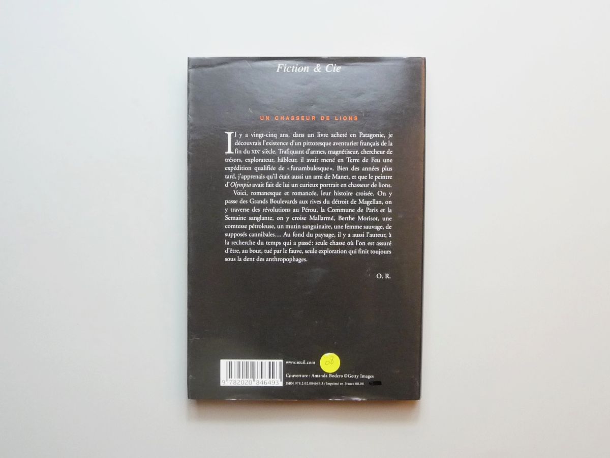Il y a vingt cinq ans, dans un livre acheté en Patagonie, je découvrais l'existence d'un pittoresque aventurier français de la fin du XIXe siècle. Trafiquant d'armes, magnétiseur, chercheur de trésors, explorateur, hâbleur, il avait mené en Terre de Feu une expédition qualifiée de "funambulesque". Bien des années plus tard, j'apprenais qu'il était aussi un ami de Manet, et que le peintre d'Olympia avait fait de lui un curieux portrait en chasseur de lions. Voici, romanesque et romancée, leur histoire croisée. On y passe des Grands Boulevards aux rives du détroit de Magellan, on y traverse des révolutions au Pérou, la Commune de Paris et la Semaine sanglante, on y croise Mallarmé, Berthe Morisot, une comtesse pétroleuse, un mutin sanguinaire, une femme sauvage, de supposés cannibales... Au fond du paysage, il y a aussi l'auteur, à la recherche du temps qui a passé: seule chasse où l'on est assuré d'être, au bout, tué par le fauve, seule exploration qui finit toujours sous la dent des anthropophages.