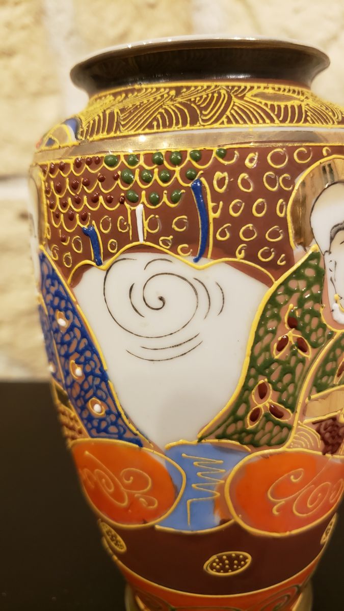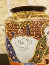Ces vases sont ornés de motifs traditionnels aux couleurs vives (rouge, bleu, jaune, orange) avec des finitions soignées qui reflètent l'artisanat japonais classique.