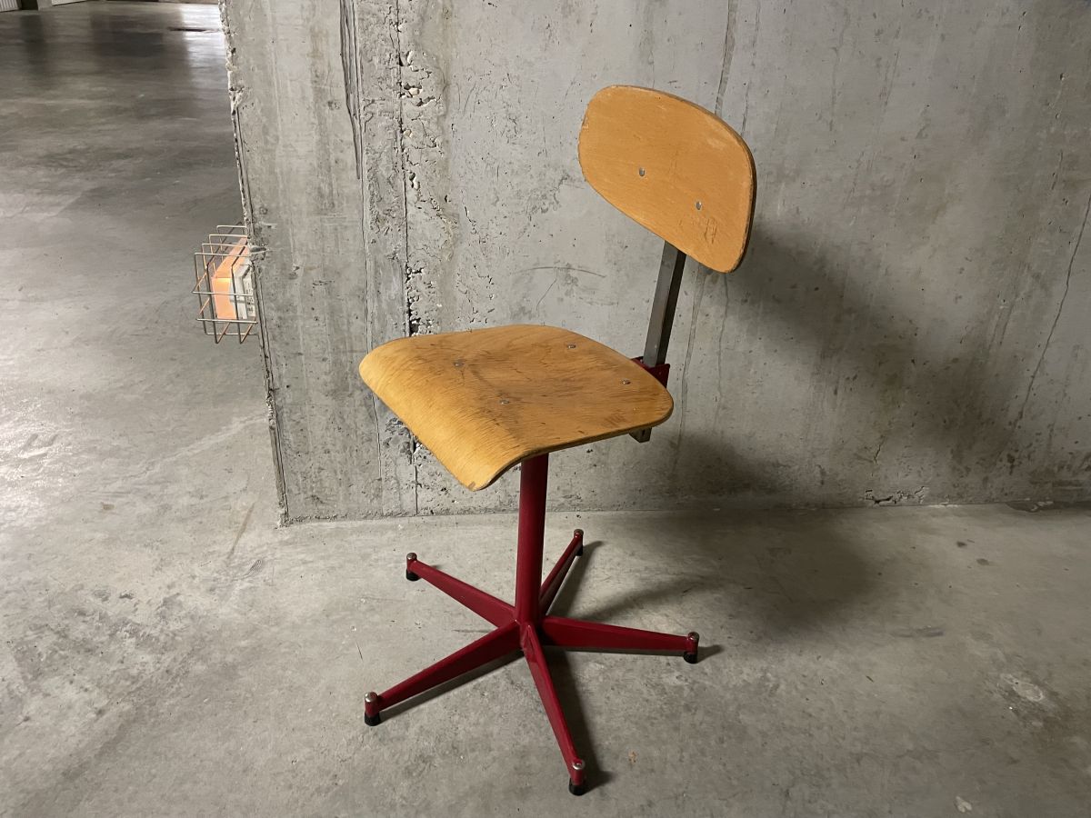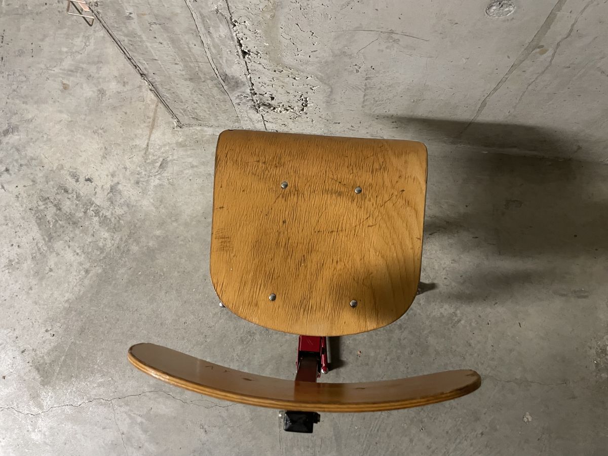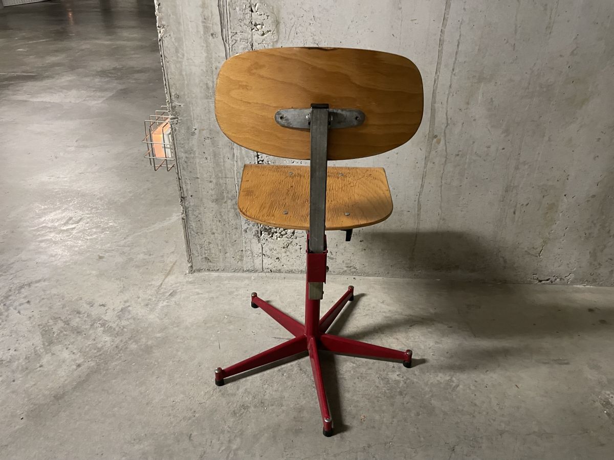 Chaise d’atelier des années 70-80, en métal rouge bordeaux et assise en bois clair, traces d’usage (voir photos), réglable en hauteur (hauteur de l’assise de 50 à 70cm), assise 36x36cm, hauteur totale 80 à 102cm, bon état.