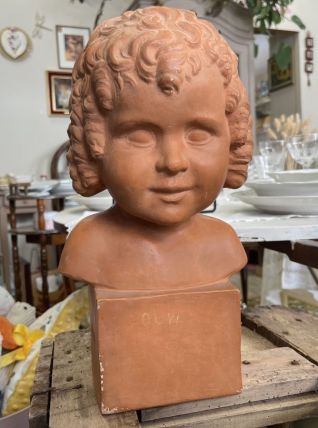 Buste d’enfant (putto) en terre cuite signé H.Rey, traces d’usage, une malencontreuse inscription sur le devant (voir photos) pouvant aisément se camoufler avec une patine, dimensions (cm) : L.17xH.30xP.15, bon état général.