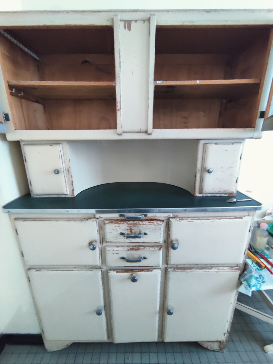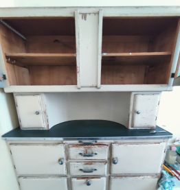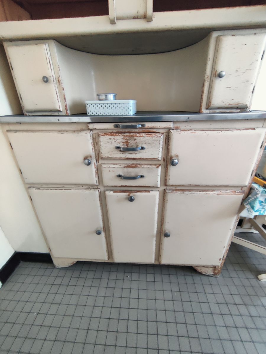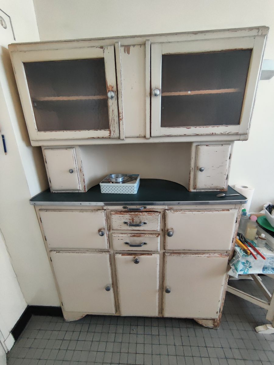 Joli buffet de cuisine Mado, 2 corps, peint de couleur beige.