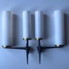 Ces appliques murales au design sculptural et raffiné se composent d'une structure en métal laqué noir mat, soulignée par des anneaux en laiton doré, et chacune est équipée de deux abat-jours cylindriques en verre opalin blanc qui diffusent une lumière douce et chaleureuse. Leur forme élancée et graphique évoque à la fois l’élégance du style mid-century modern, l’influence Art Déco et le raffinement du design français d’après-guerre.