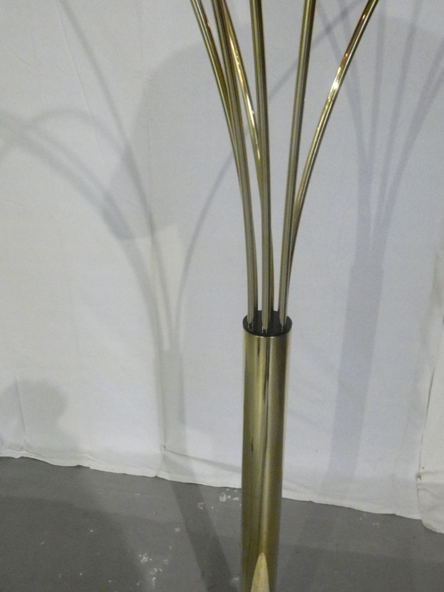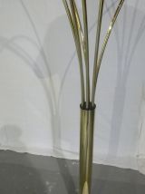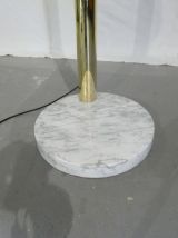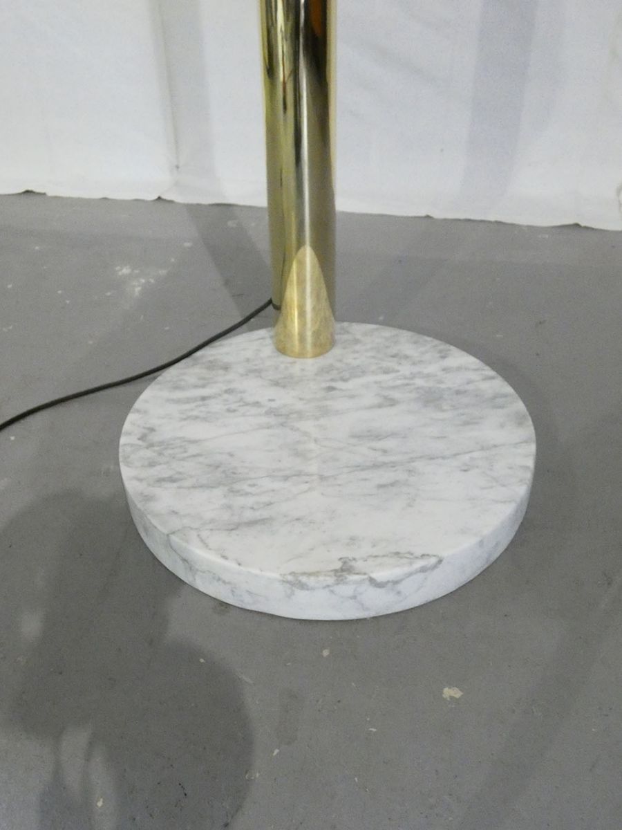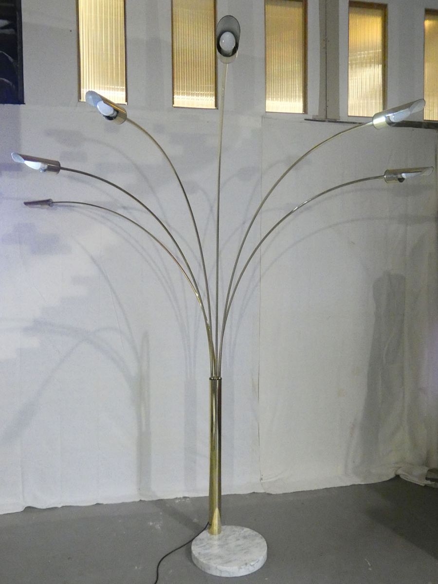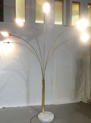 Très grand arco italien à 6 branches en laiton massif des années 70, piétement en marbre de carrare, 6 ampoules led fournis, 24 watts pour.
