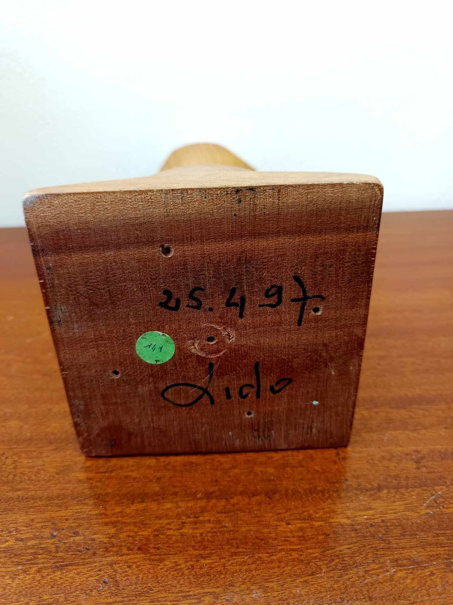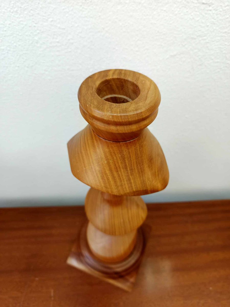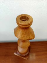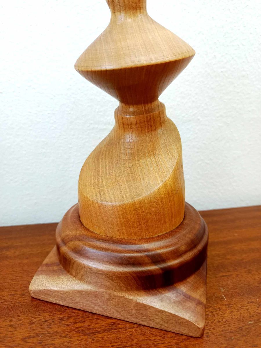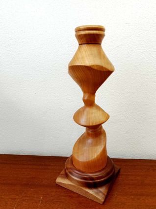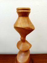 Travail de bois sculpté (probablement un bois fruitier avec une belle veine) en forme de totem.