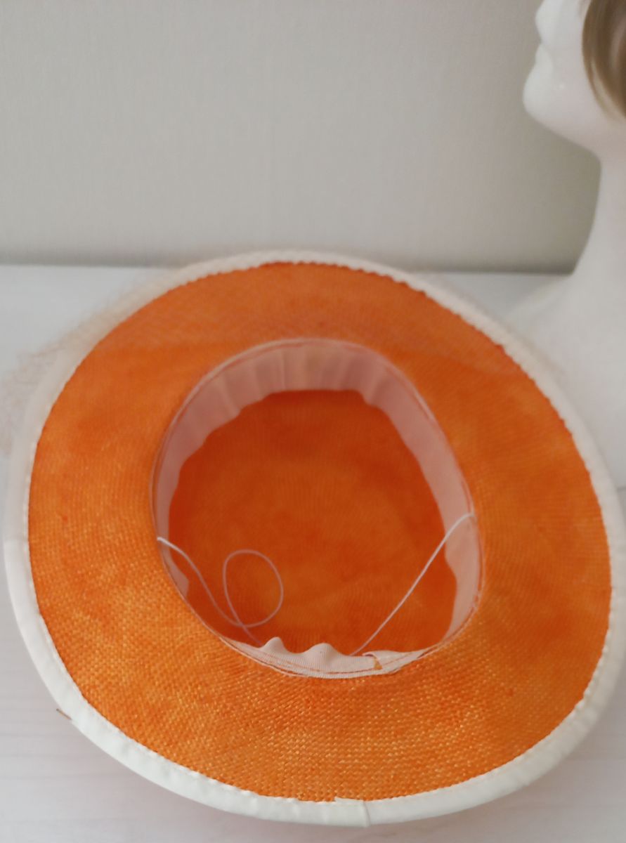 Idéal pour les cérémonies des beaux jours, chapeau en paille orange avec voilette, ruban satin écru et fleur en tissu blanc. Cordon élastique intérieur pour un bon maintien. Diamètre envergure extérieure 34 cm, hauteur 12 cm. Excellent état neuf. Envoi par Mondial relay. Retrait possible sur place à Royan (17) contre règlement en espèces uniquement.