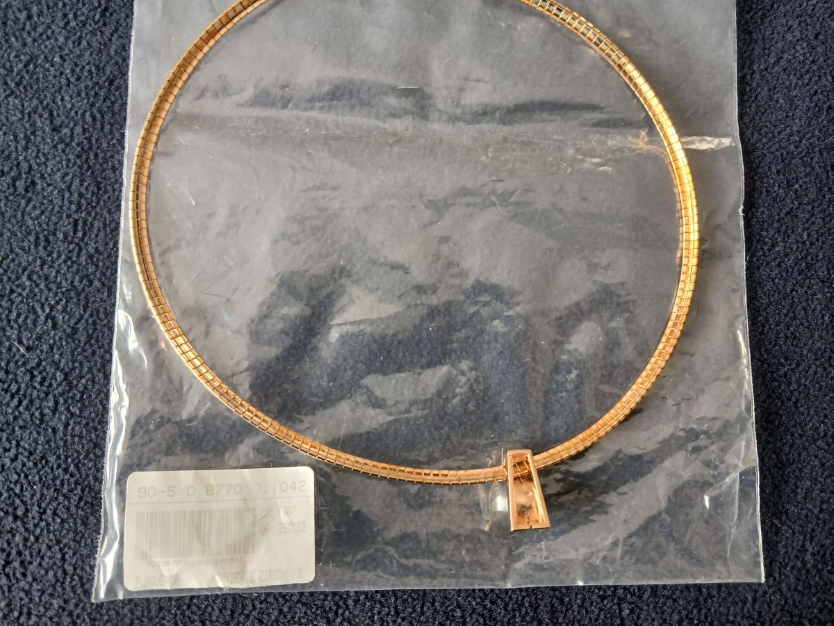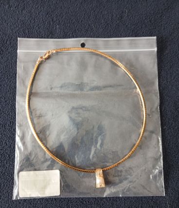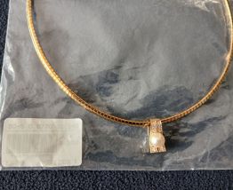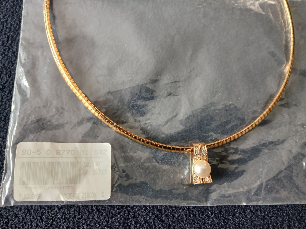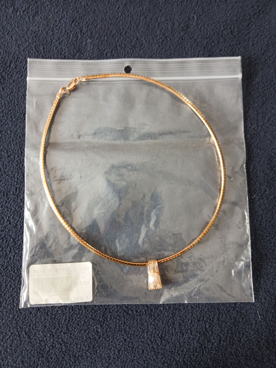 Beau collier semi rigide, maille plate avec pendentif perle d'eau douce et oxyde de zirconium. Modèle ras de cou, taille 42 cm de diamètre. Totalement neuf avec étiquette, sous emballage d'origine. Envoi par Mondial relay. Retrait possible à Royan (17) contre règlement en espèces uniquement
