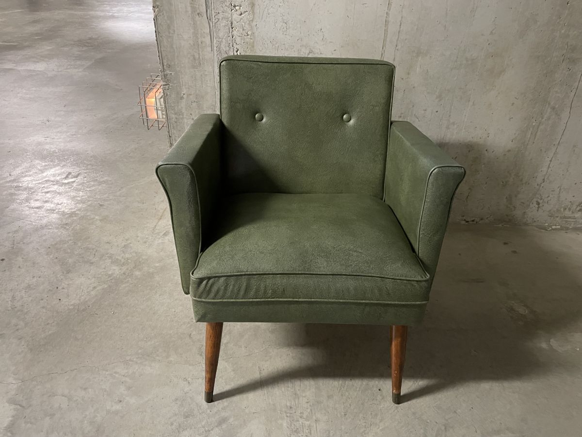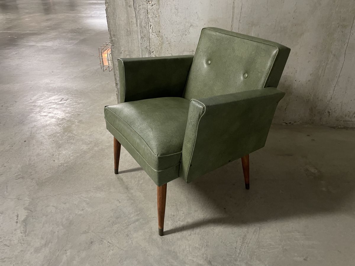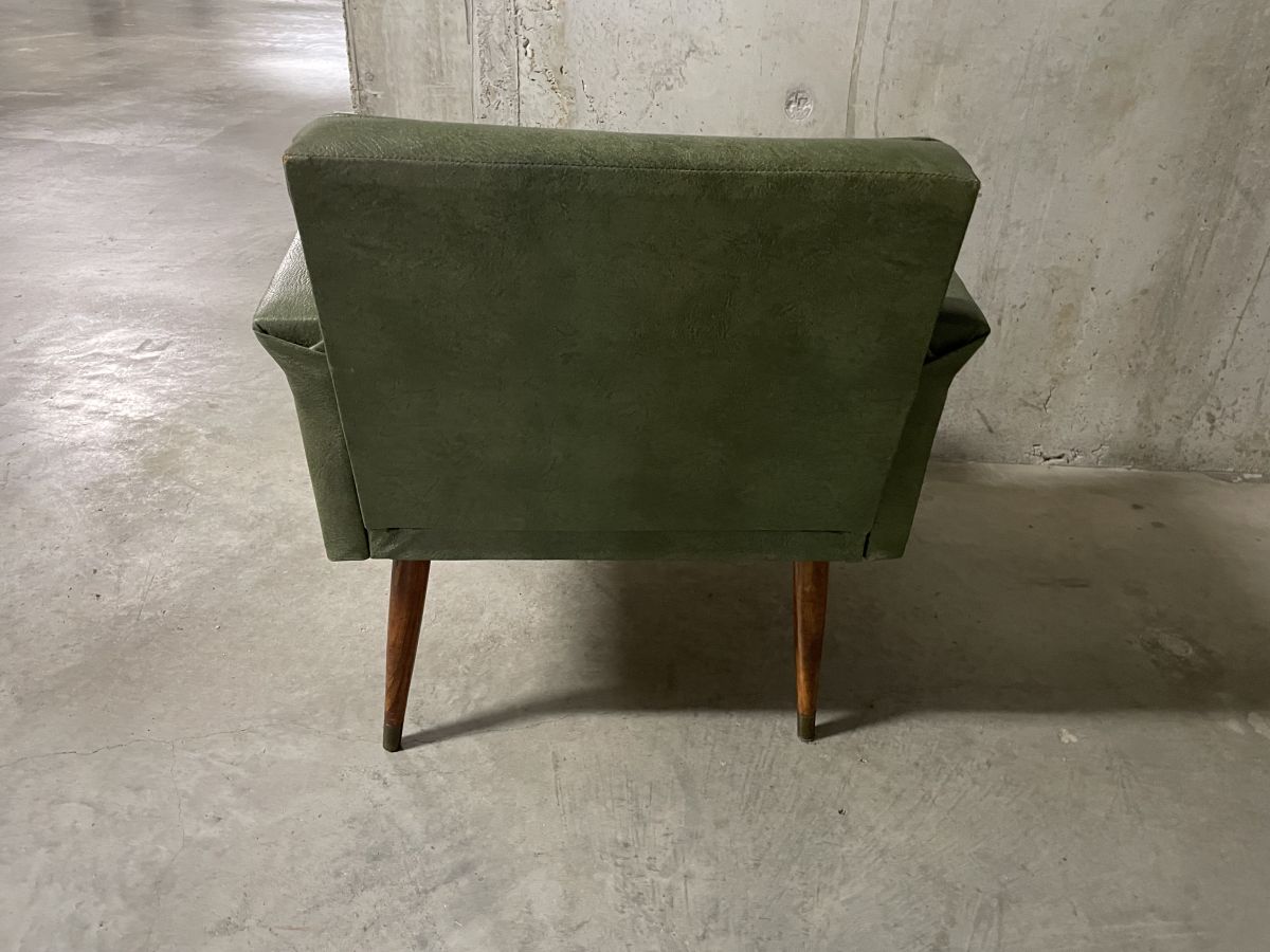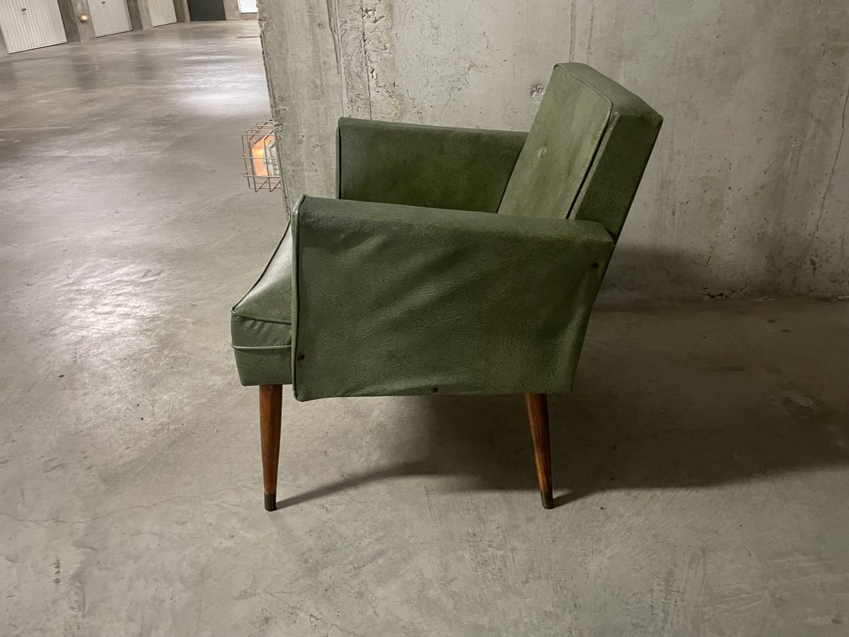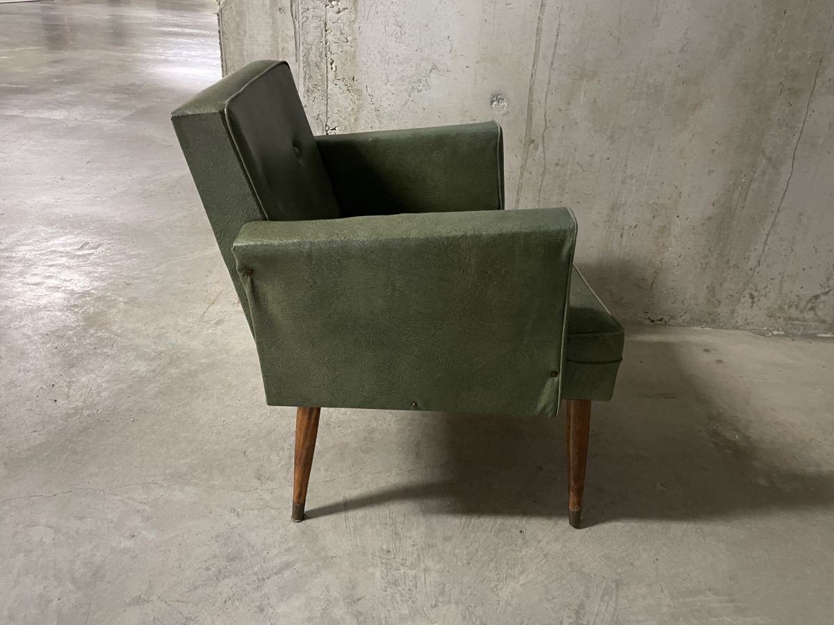 Fauteuil bridge des années 60 en skaï vert, structure très saine, pieds fuseaux, fabrication américaine (estampillé) hauteur 73cm, hauteur assise 43cm, assise 47x50cm, encombrement (cm) : L.67xP.67, bon état général.