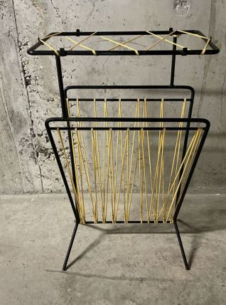 Porte-revues des années 50 en métal noir et scoubidou jaune, dimensions (cm) : L.34xH.58xP.21, bon état.