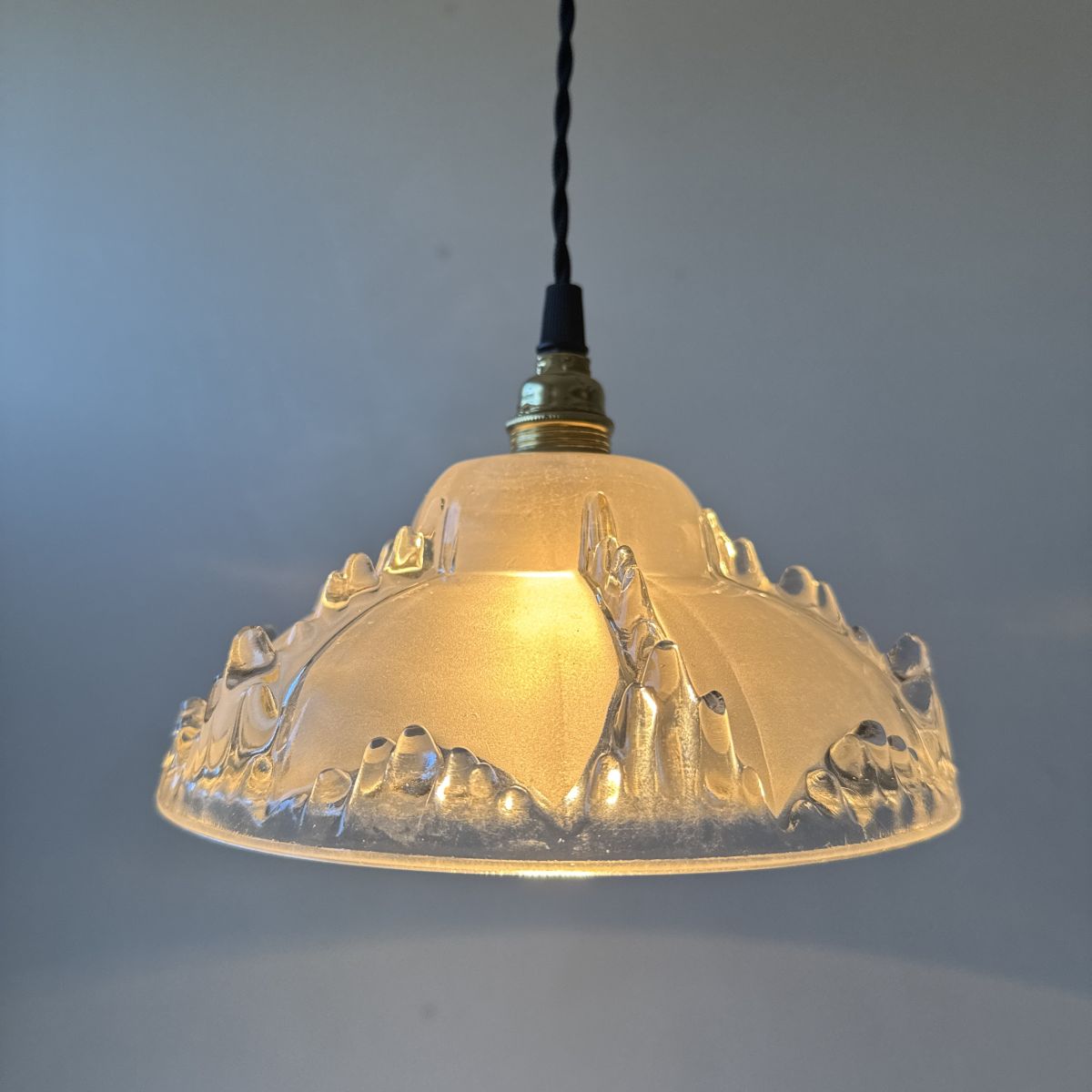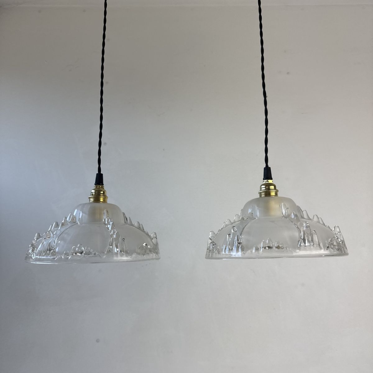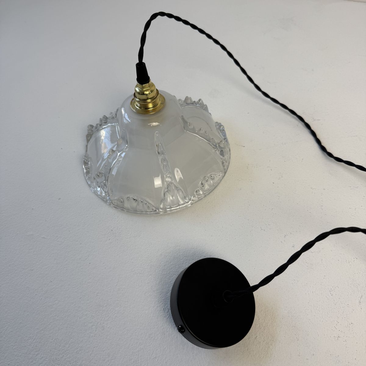 L’électricité a été refaite. Douille à vis en laiton (Ampoules E14). Branchement par domino. Fil noir en tissu tressé et rosace de fixation en métal.