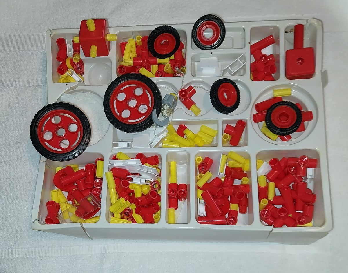 excellent jeu de construction selon les modèles de la boite ou selon notre imagination. Les pièces sont en très bon état mais la boite principale en carton et celle de l'intérieur en plastique sont en mauvais état. La boite sera scotchée pour éviter toute perte de pièces. Plein de chose en vente, réduction assurée pour 2 achats simultanés. Frais de port recalculés dès le 2ème article dans la même commande. Vendeur sérieux et rapide.