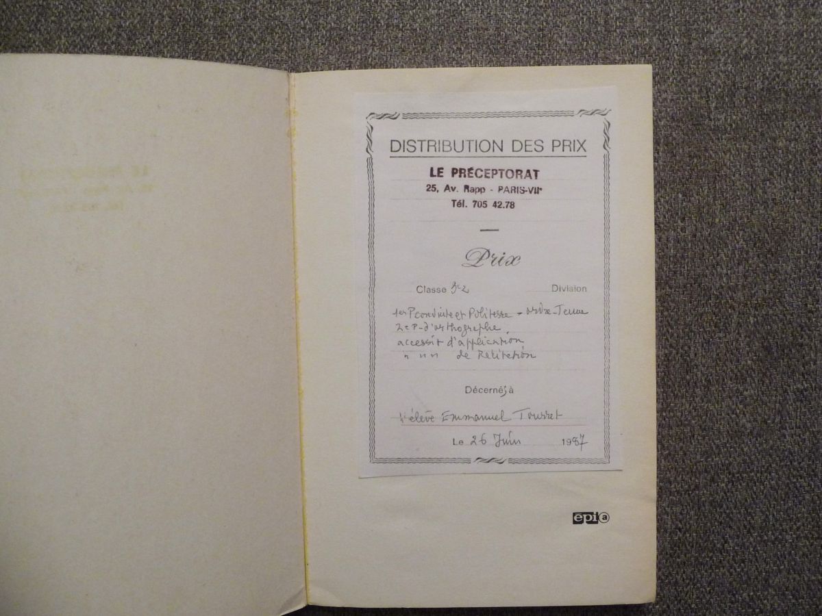 * Livre offert lors d'une remise des prix en 1987 par Le Préceptorat ( papier collé sur 1 page)