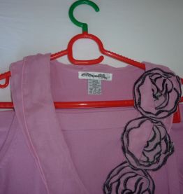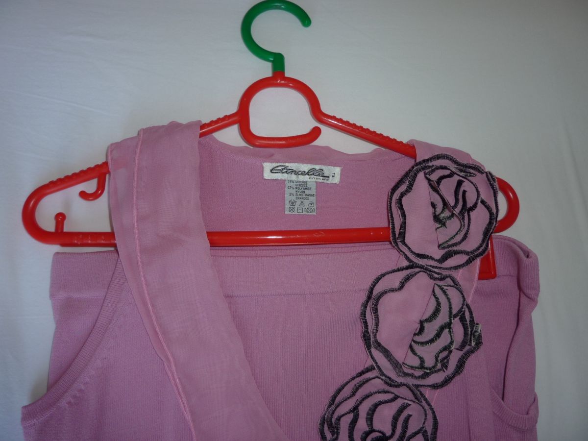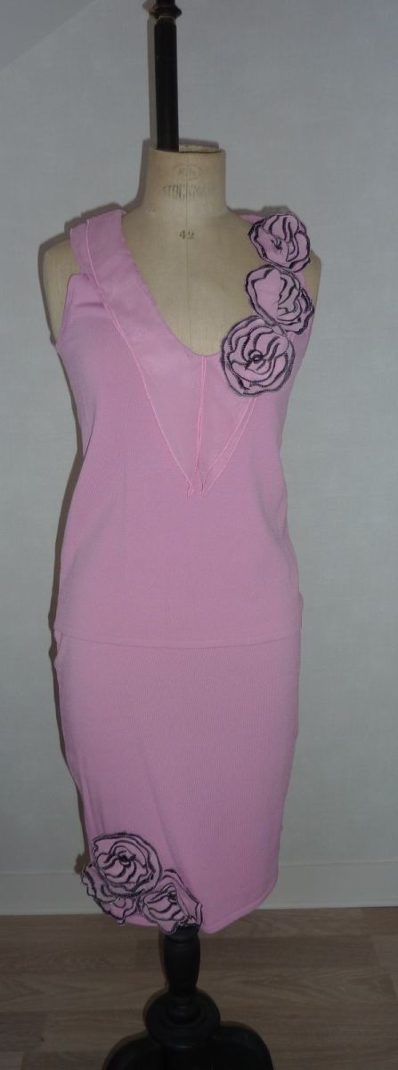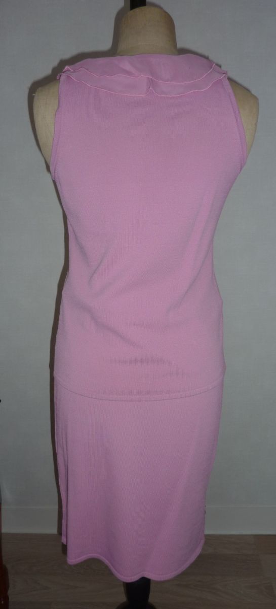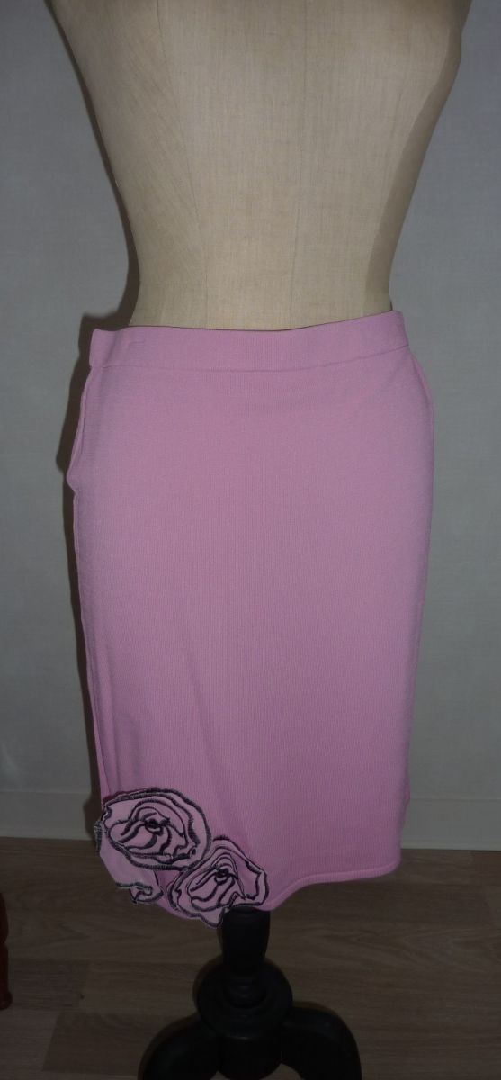 Bel ensemble chic et stylé composé d'un top et jupe en fine maille rose avec application de fleurs.