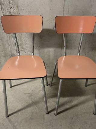 Paire de chaises en formica des années 60, couleur pêche, traces d’usage et petits accrocs absolument sans conséquence esthétique (voir photos), hauteur 78cm, hauteur assise 44cm, assise 35x38cm, bon état général.