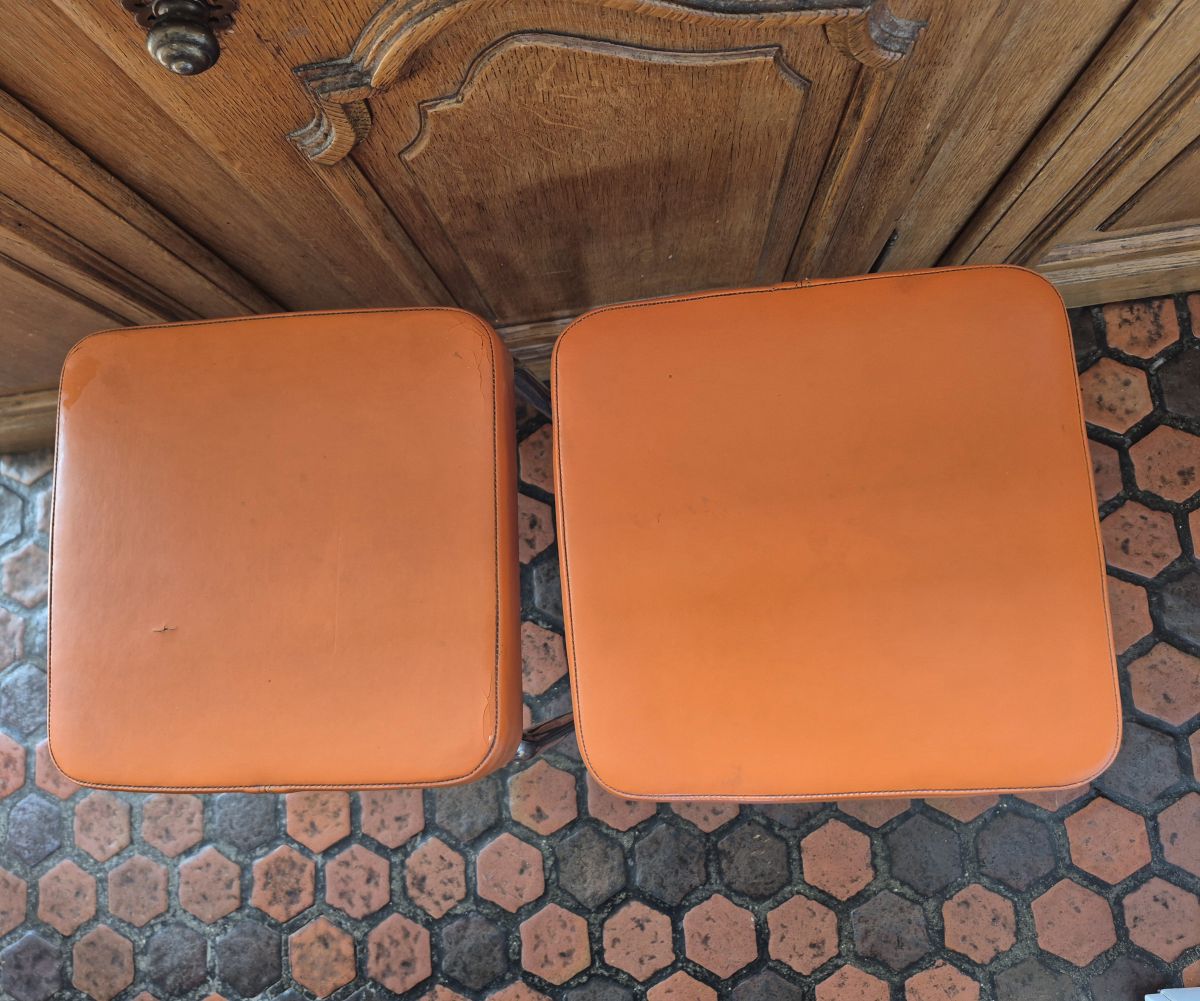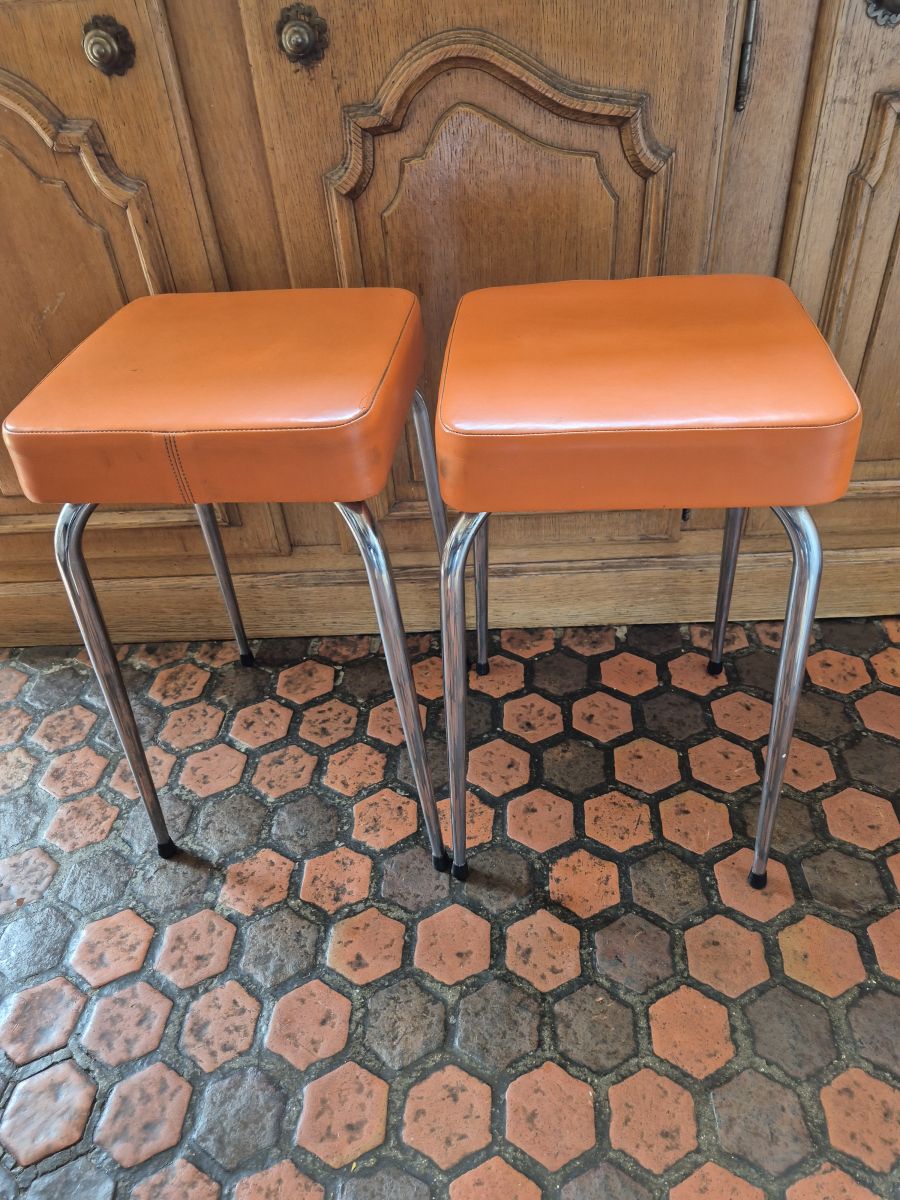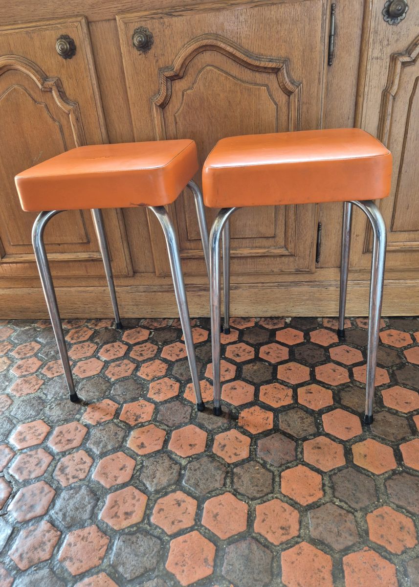 Lot de 4 tabourets vintage 60's, en skaï orange. Pieds chromés. Hauteur 45cm environ. Assise carrée de 30cm X 30cm environ. Epaisseur d'assise 6cm environ.