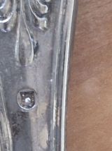 Motif élégant avec coquille et arabesques, typique des modèles de style Louis XV. Les deux pièces sont en métal argenté, avec un poinçon visible (voir photo rapprochée) indiquant probablement un grammage d’argent.