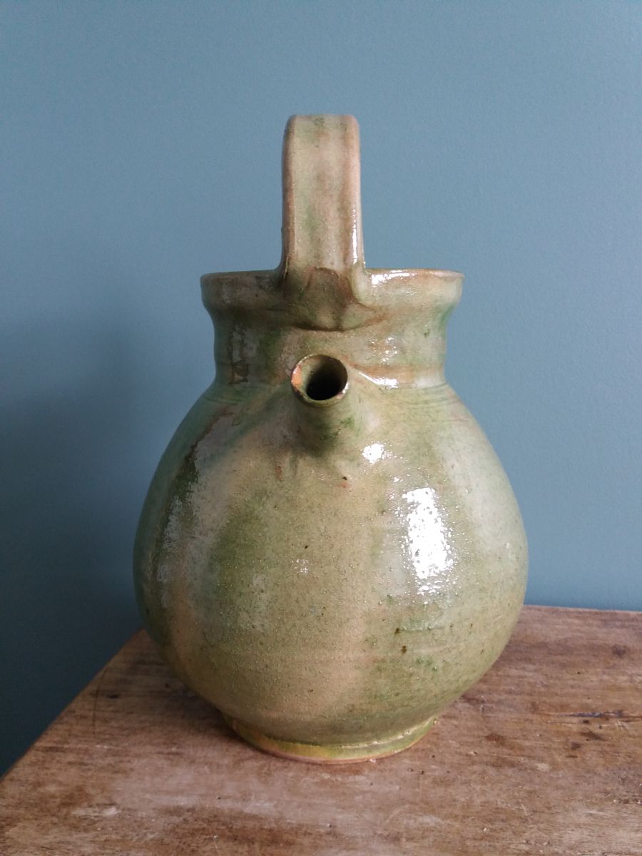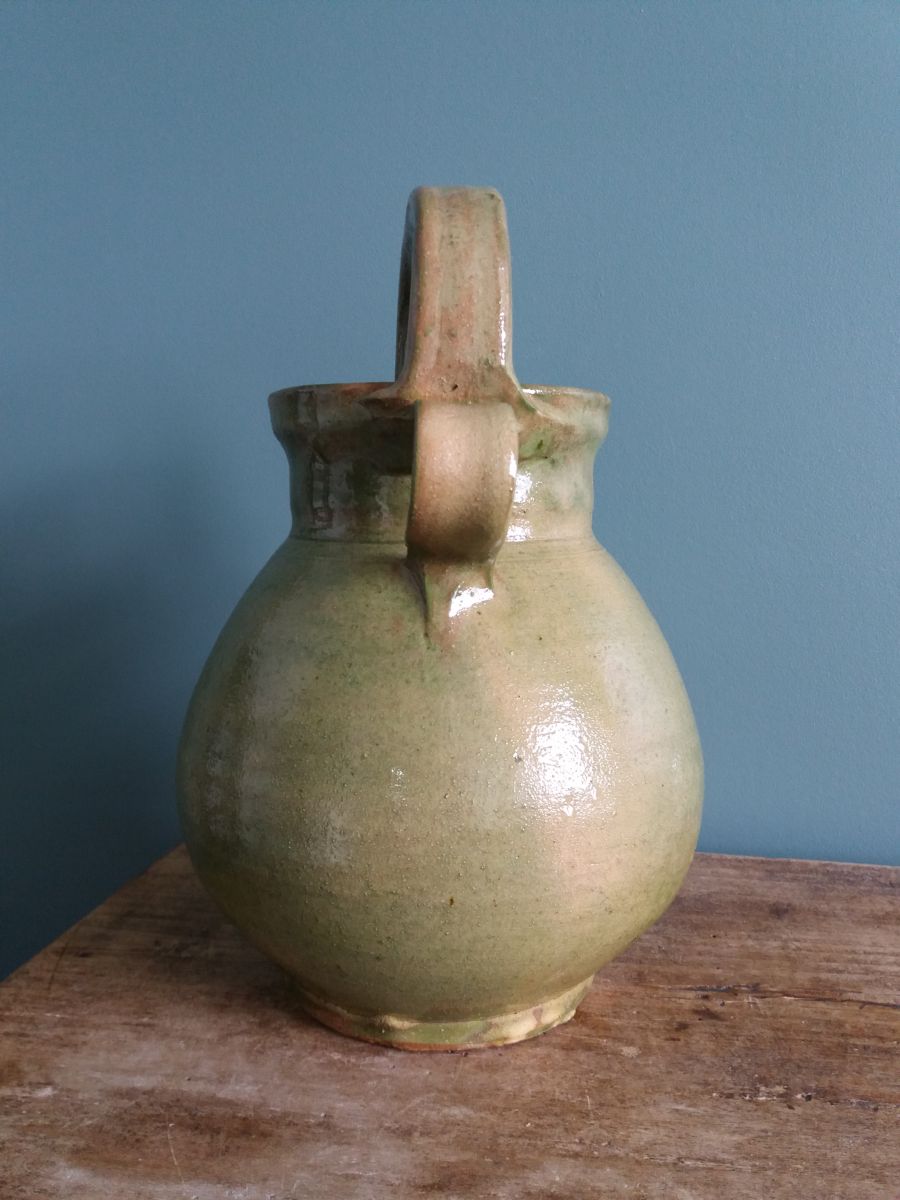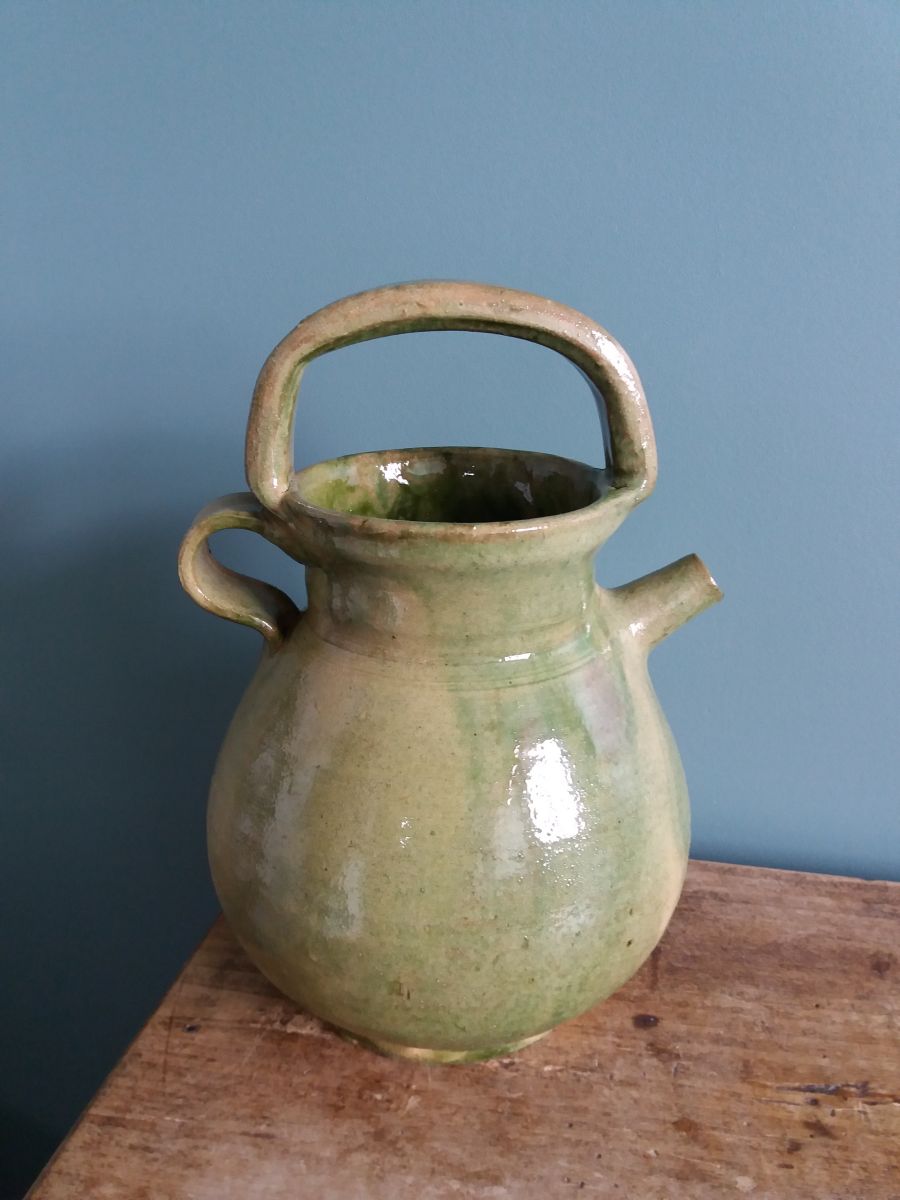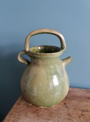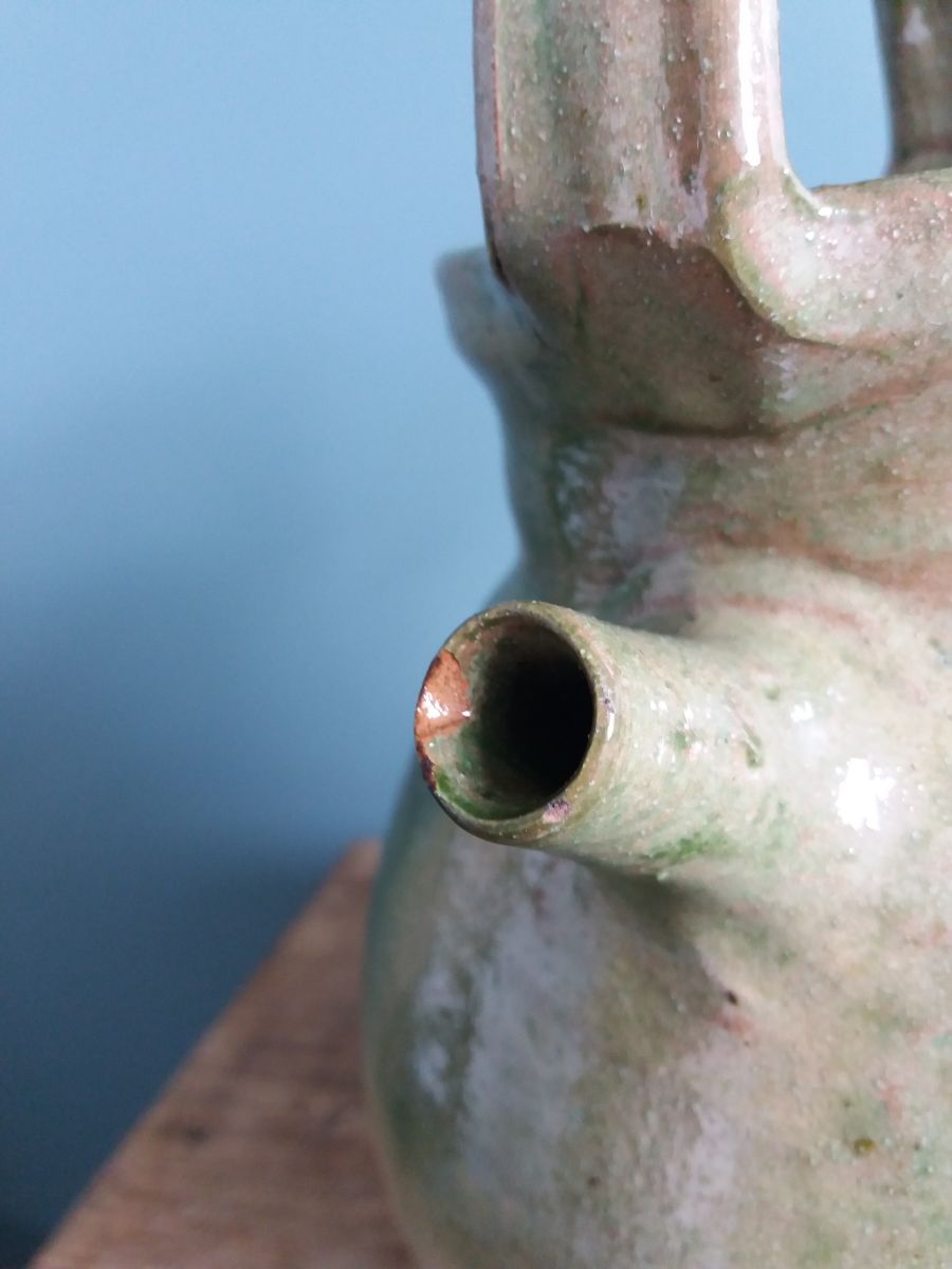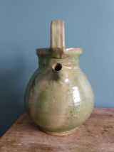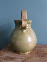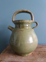 Charmante gargoulette en terre cuite avec un émaillage dans les tons verts (très légèrement plus vif que sur les photos) et beige. Sa forme est jolie, toute en rondeur, avec une double anse.