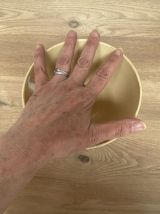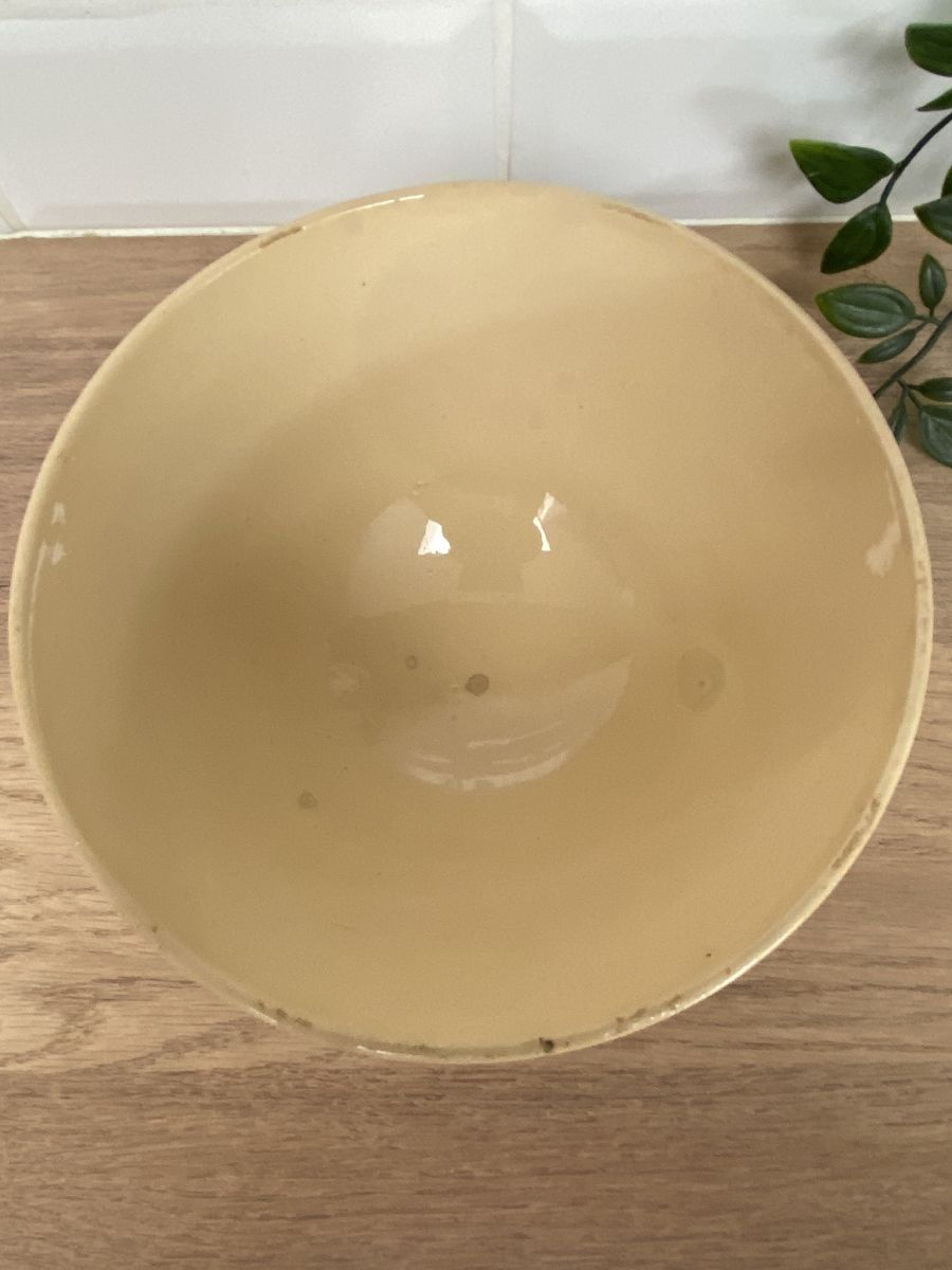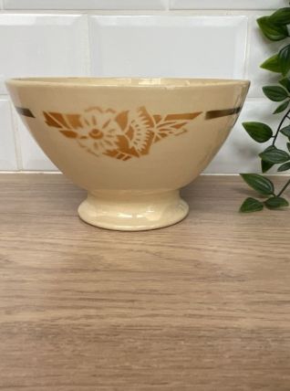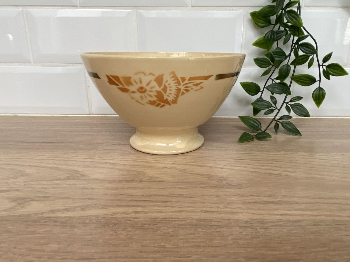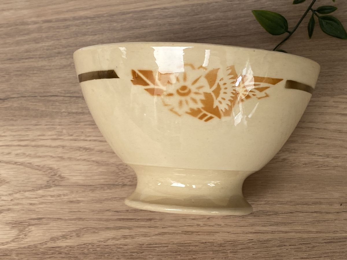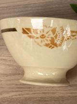Bol ancien en demi porcelaine Badonviller. Pas de fêle, bel état avec défauts de fabrication, et quelques tâches. Motif floral jaune. Diamètre 16,5 cm, hauteur 9,6 cm, diamètre du pied 8,5 cm. V1154