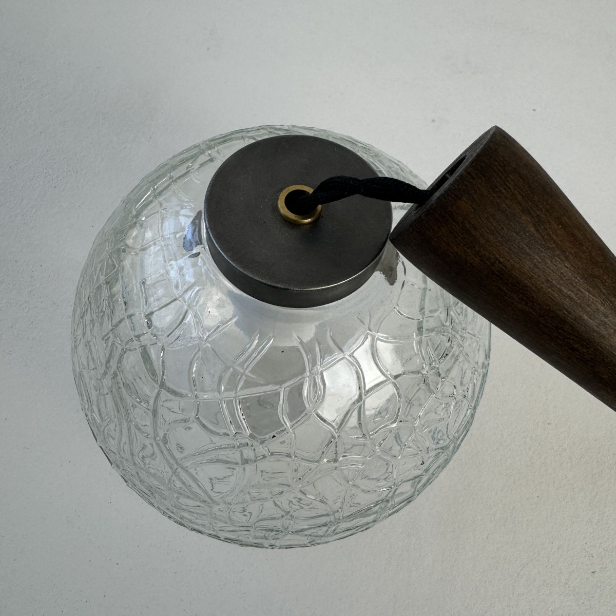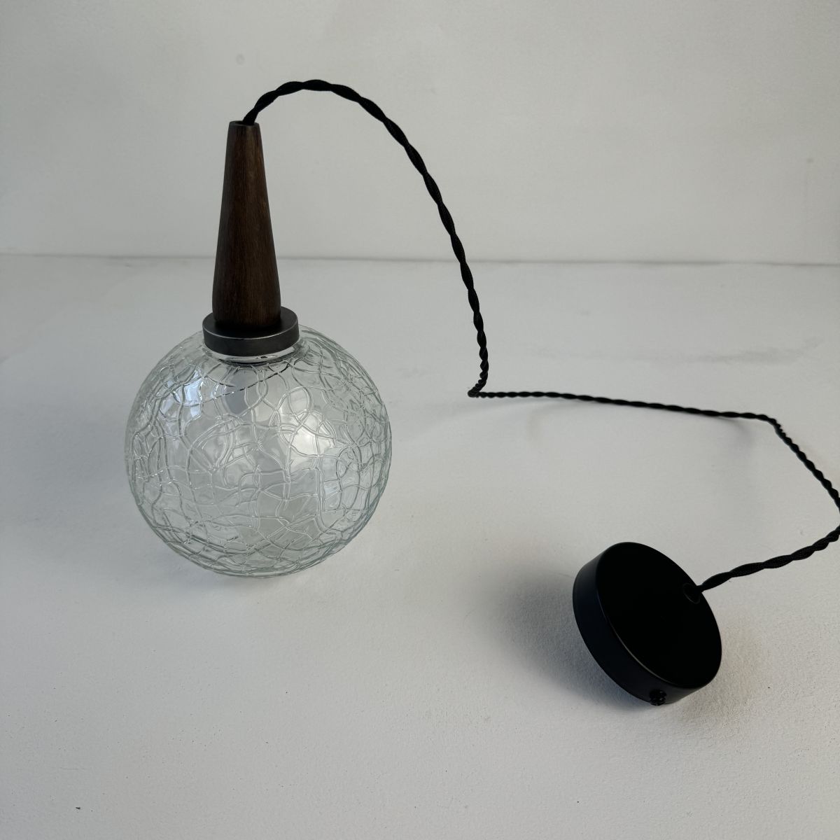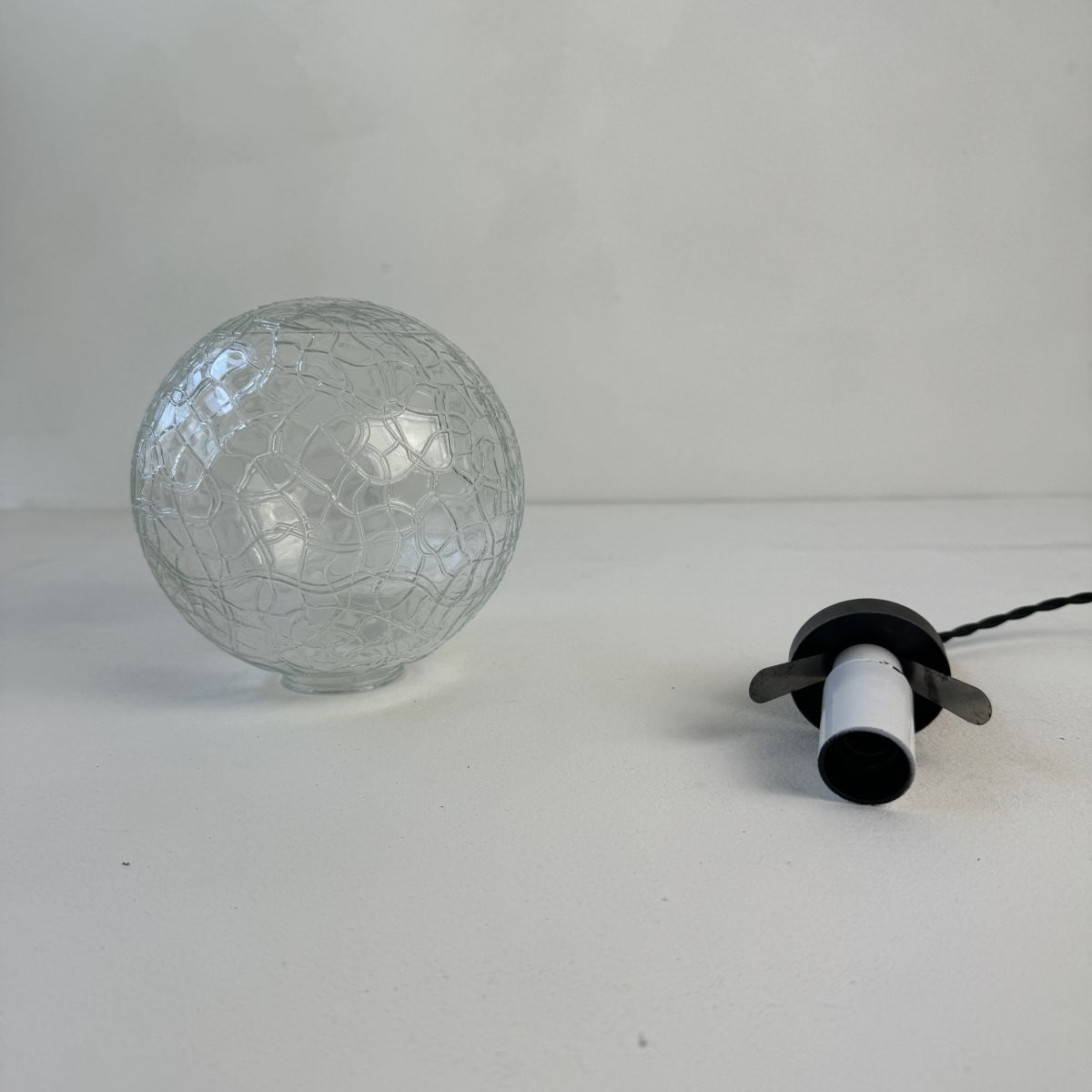 Electricité refaite à neuf avec fil noir en tissu tressé. Prête à brancher par domino. Douille à vis petit culot (Ampoules E14). Rosace en métal noir pour accroche au plafond.