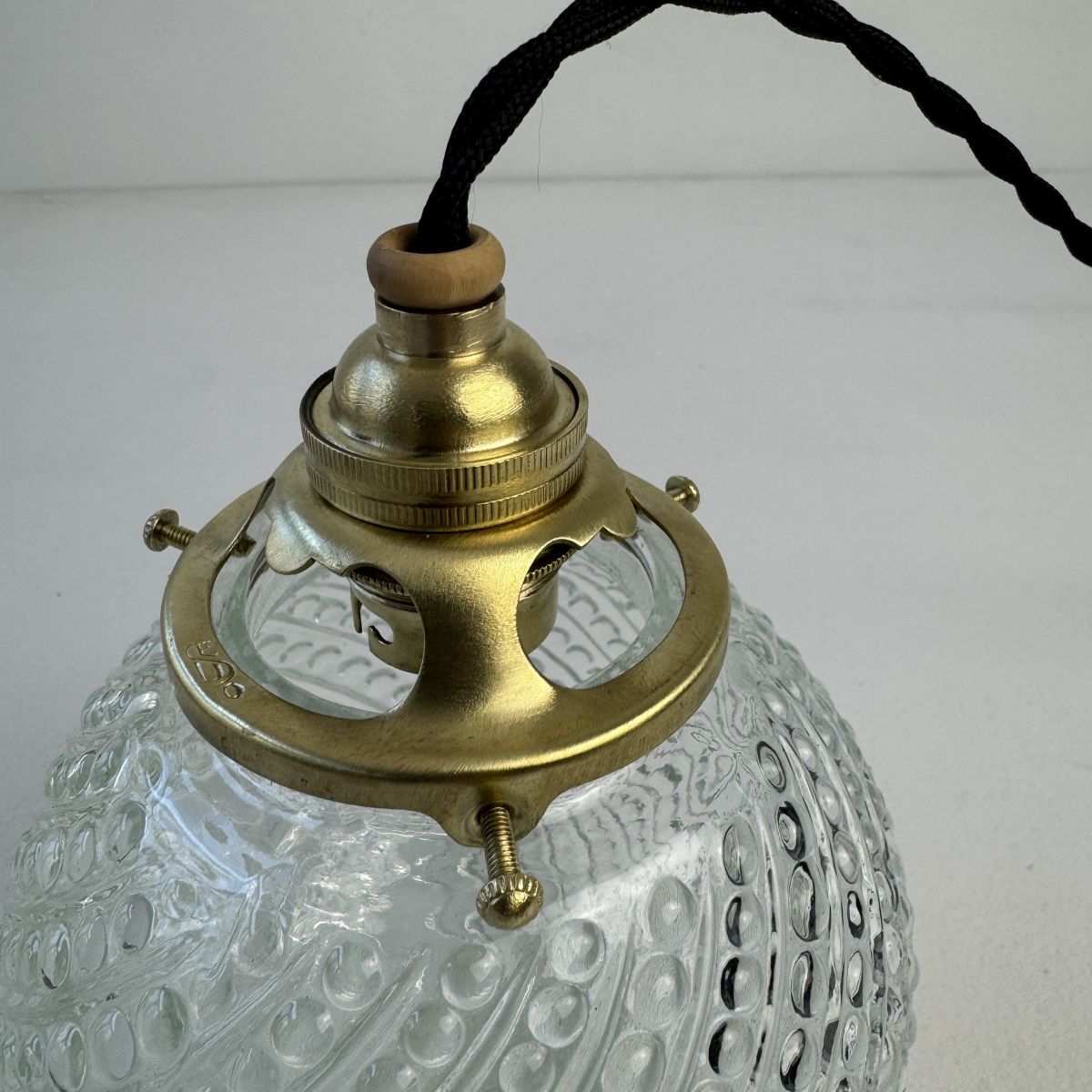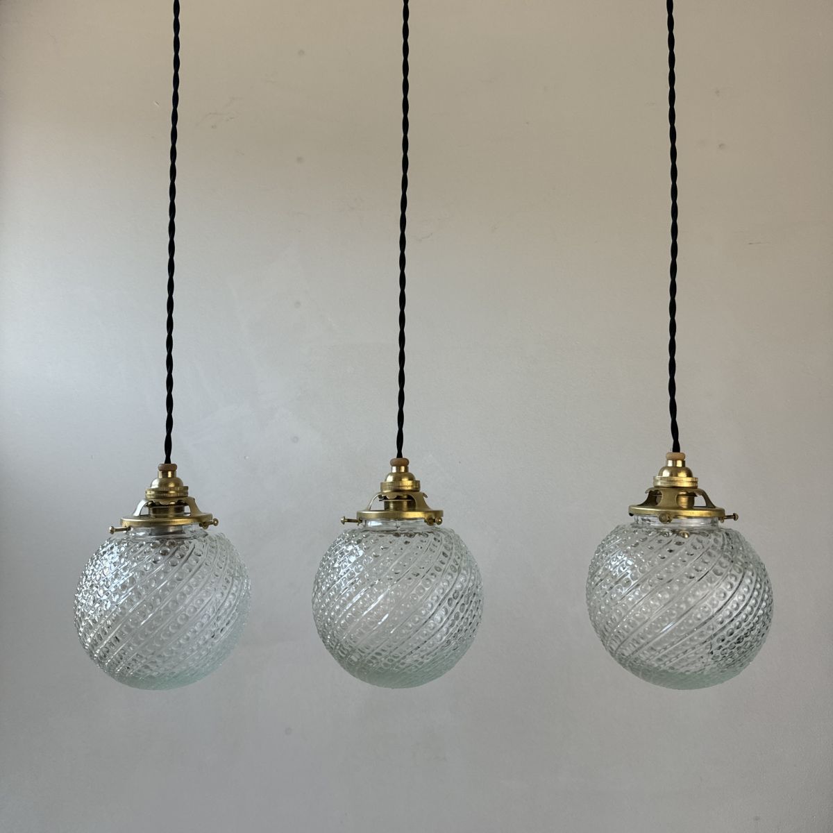 Trio de suspensions en verre texturé en très bel état. Griffe en laiton, passe-fil en buis.