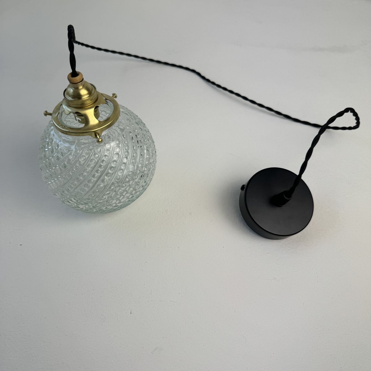 Electricité refaite à neuf avec fil noir en tissu tressé. Prête à brancher par domino. Douille à baïonnette en laiton (Ampoules B22). Rosace en métal noir pour accroche au plafond.