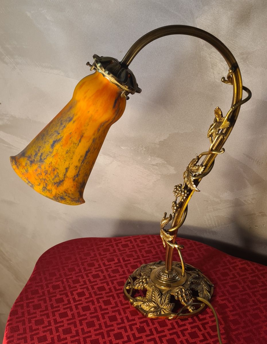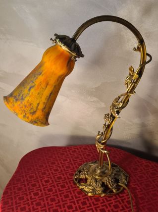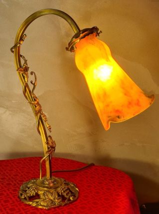 lampe de bureau art nouveau bronze et laiton doré 41x31tres jolie modele , grande tulipe pate de verre