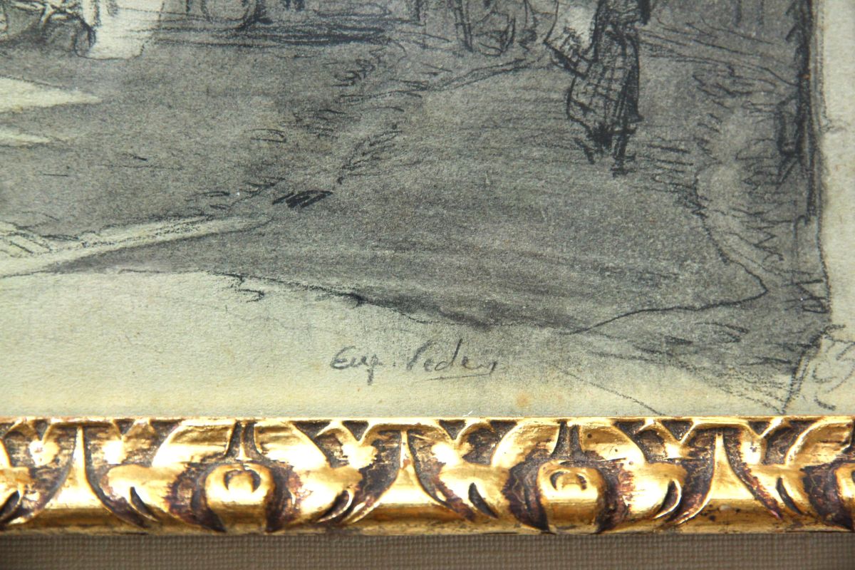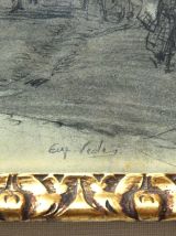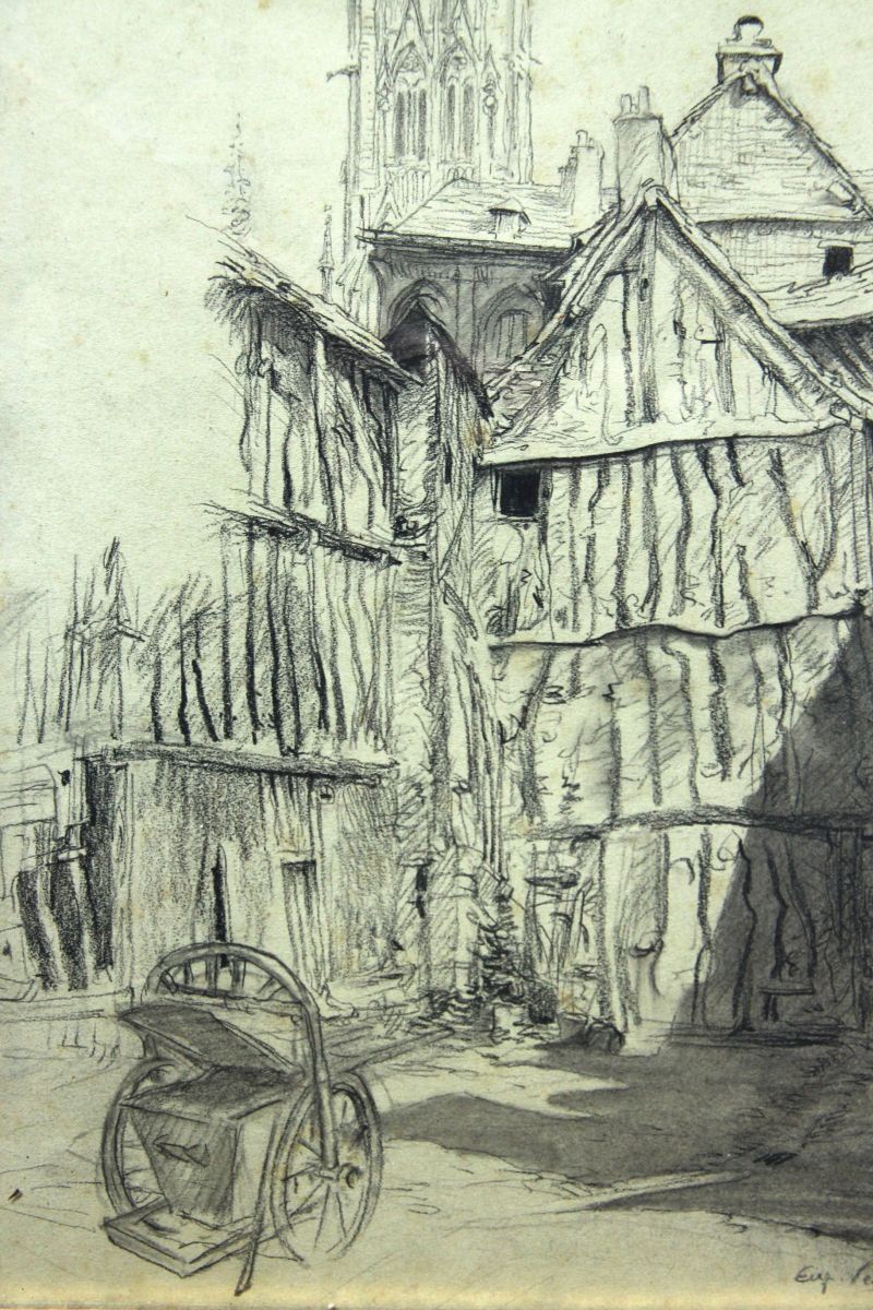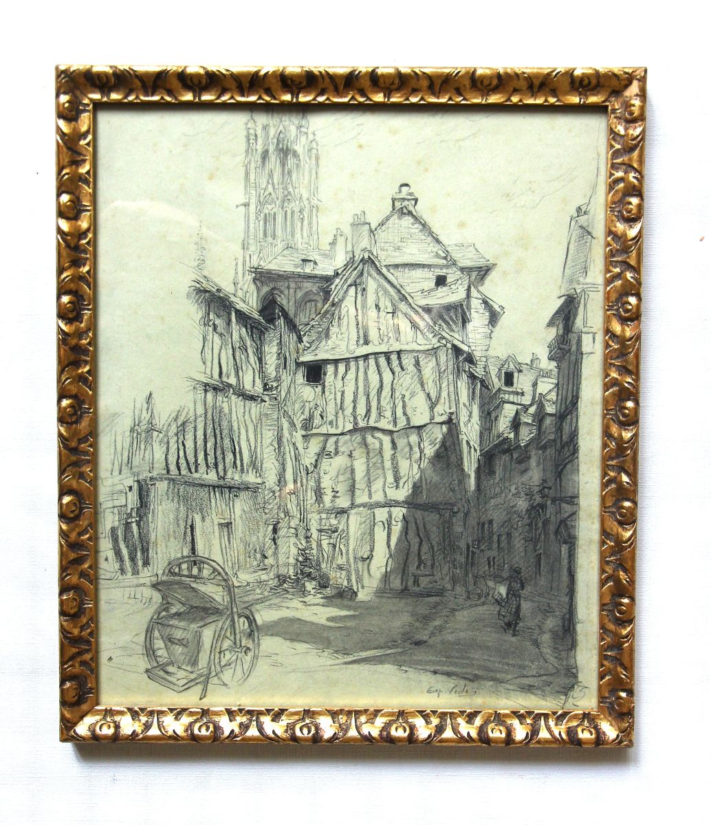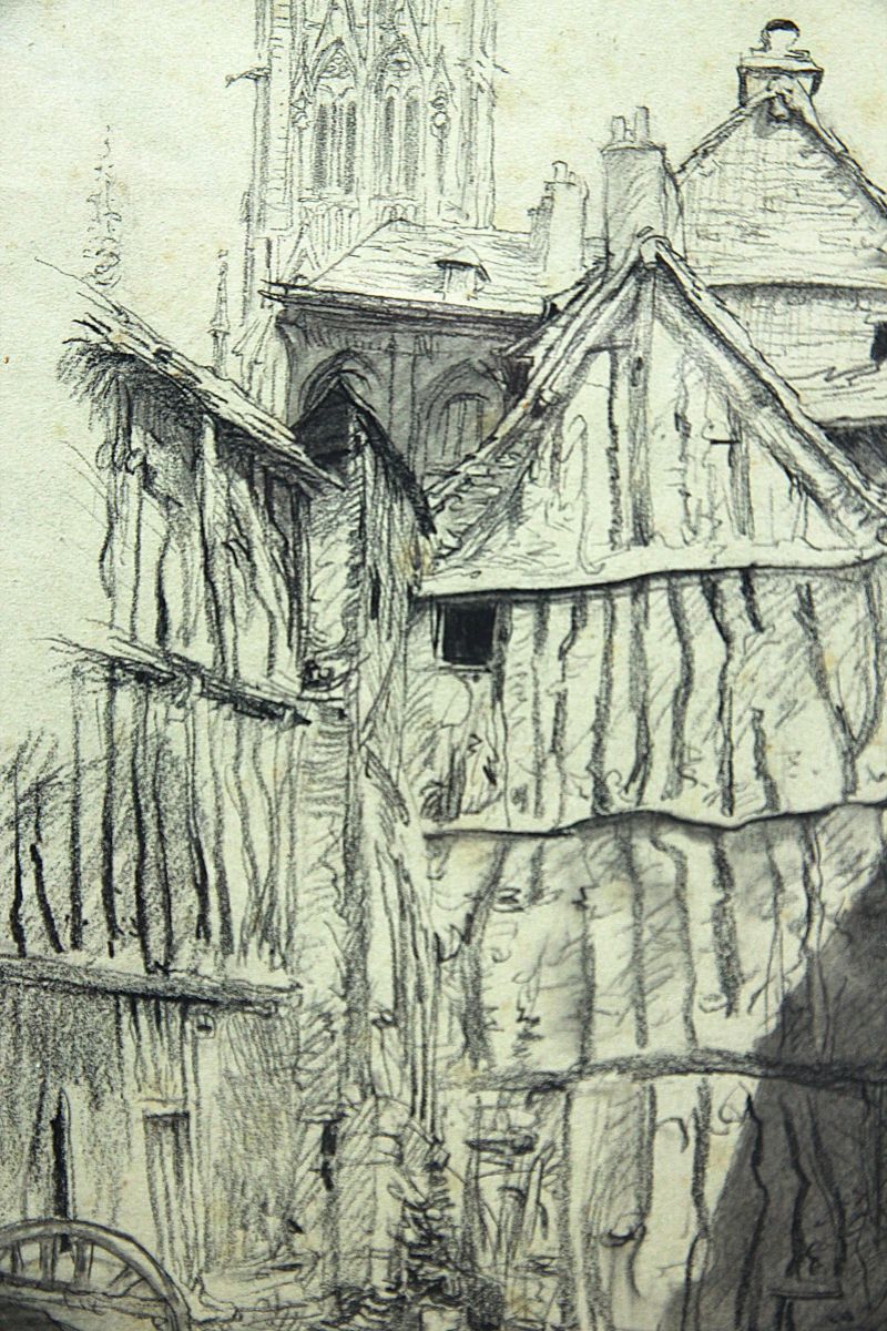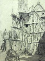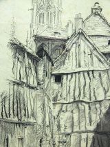 Dessin encadré d'Eugène Véder "Rouen. La maison penchée".