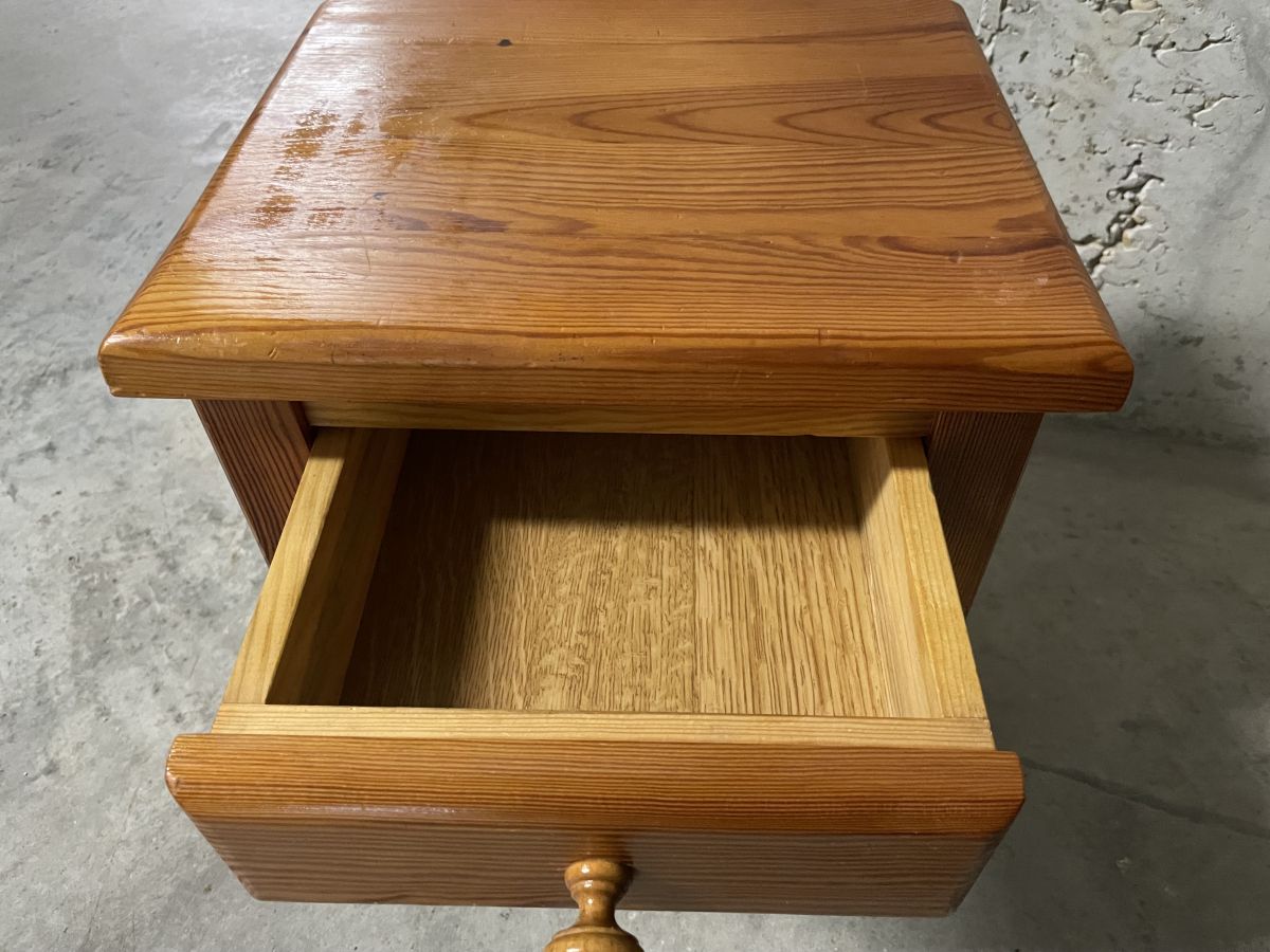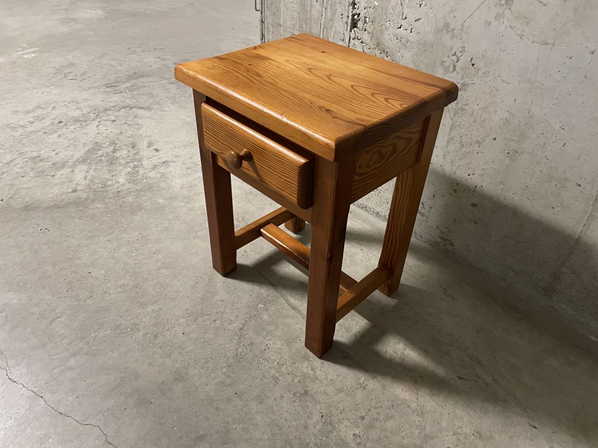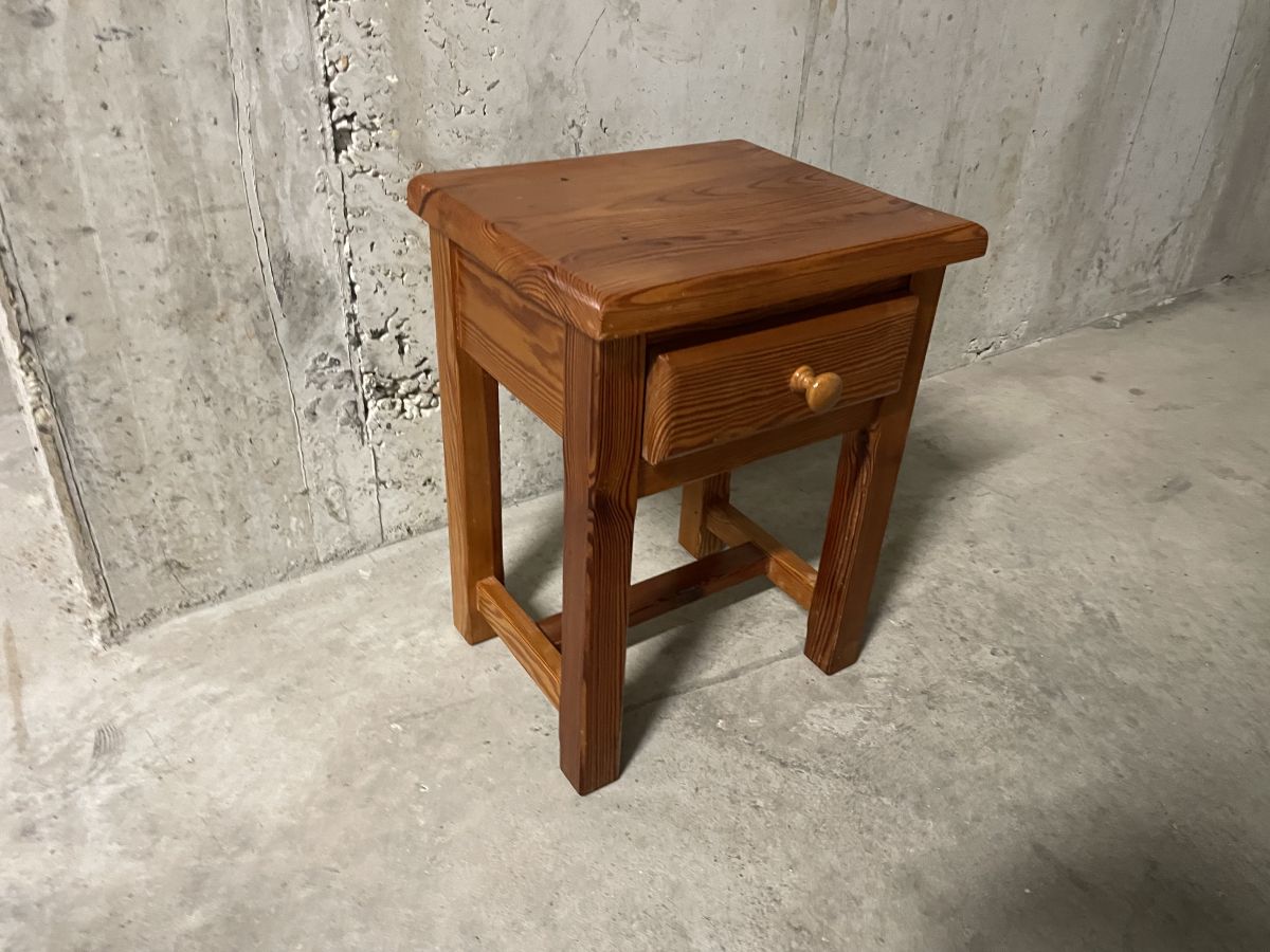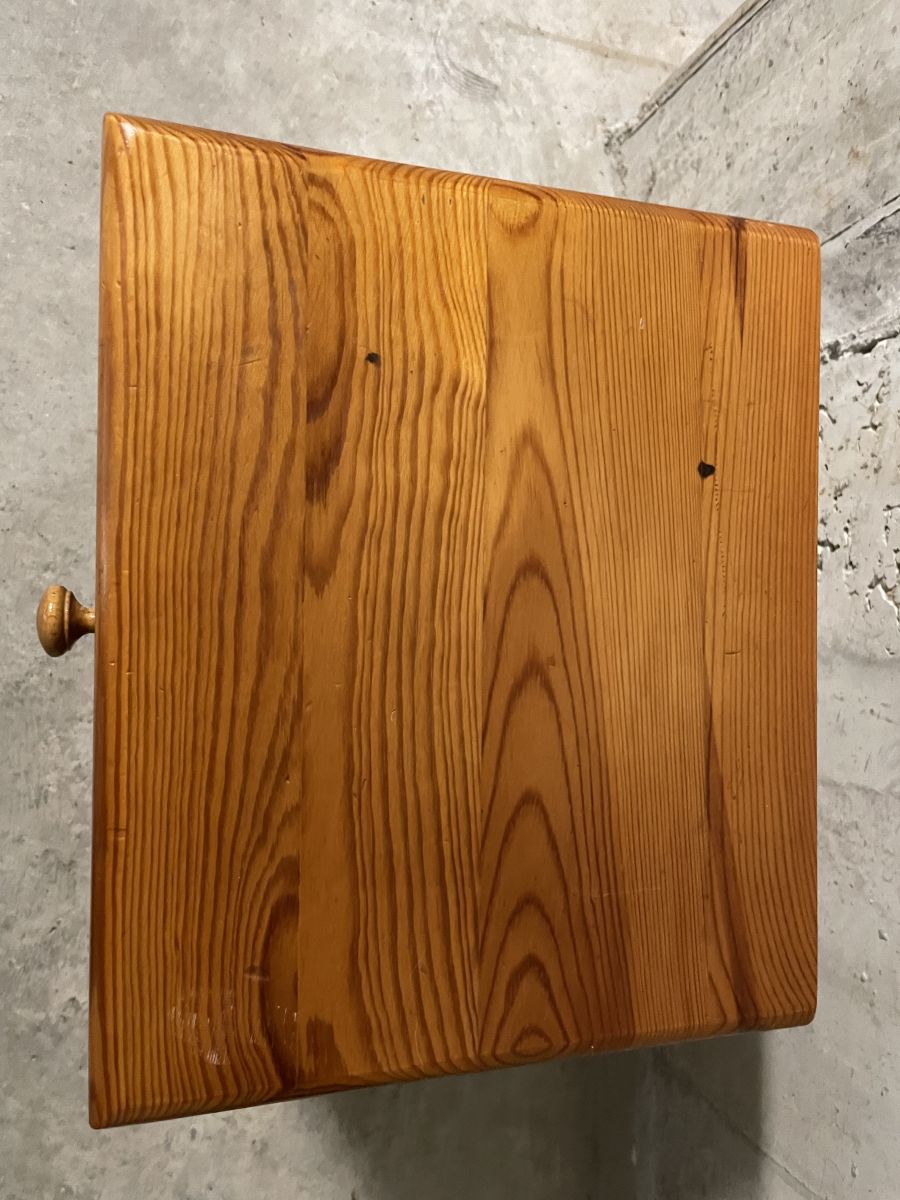 Petit chevet des années 70 en pin massif dans le goût de Charlotte Perriand pour les Arcs, traces d’usage (voir photos), superbe patine miel, très solide et stable, dimensions (cm) : L.32xH.42xP.27, bon état.
