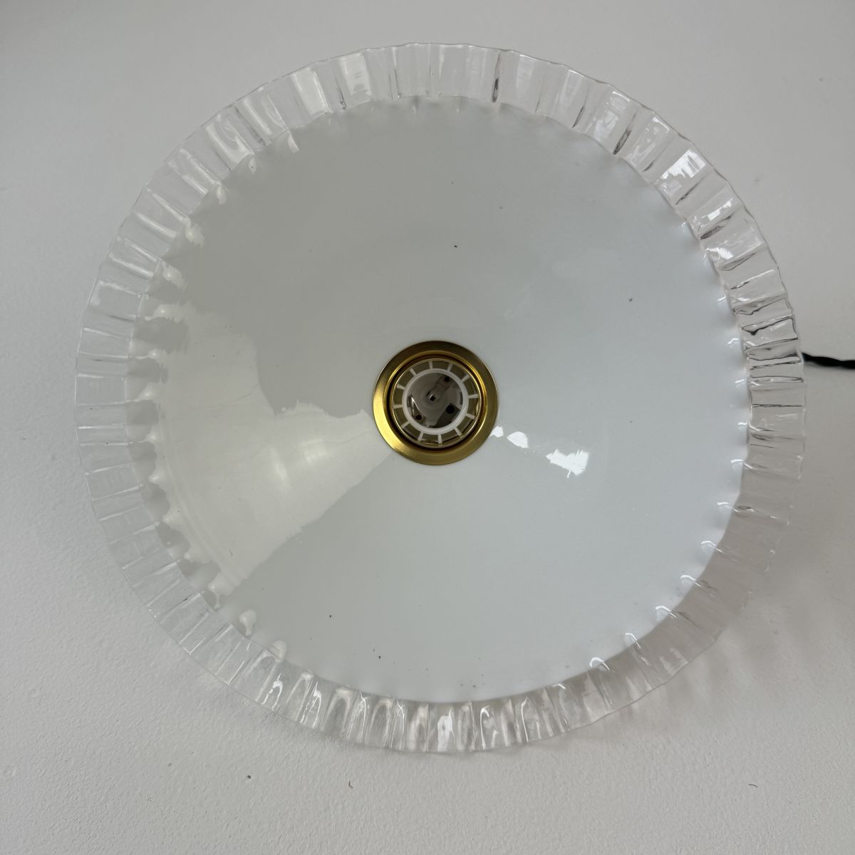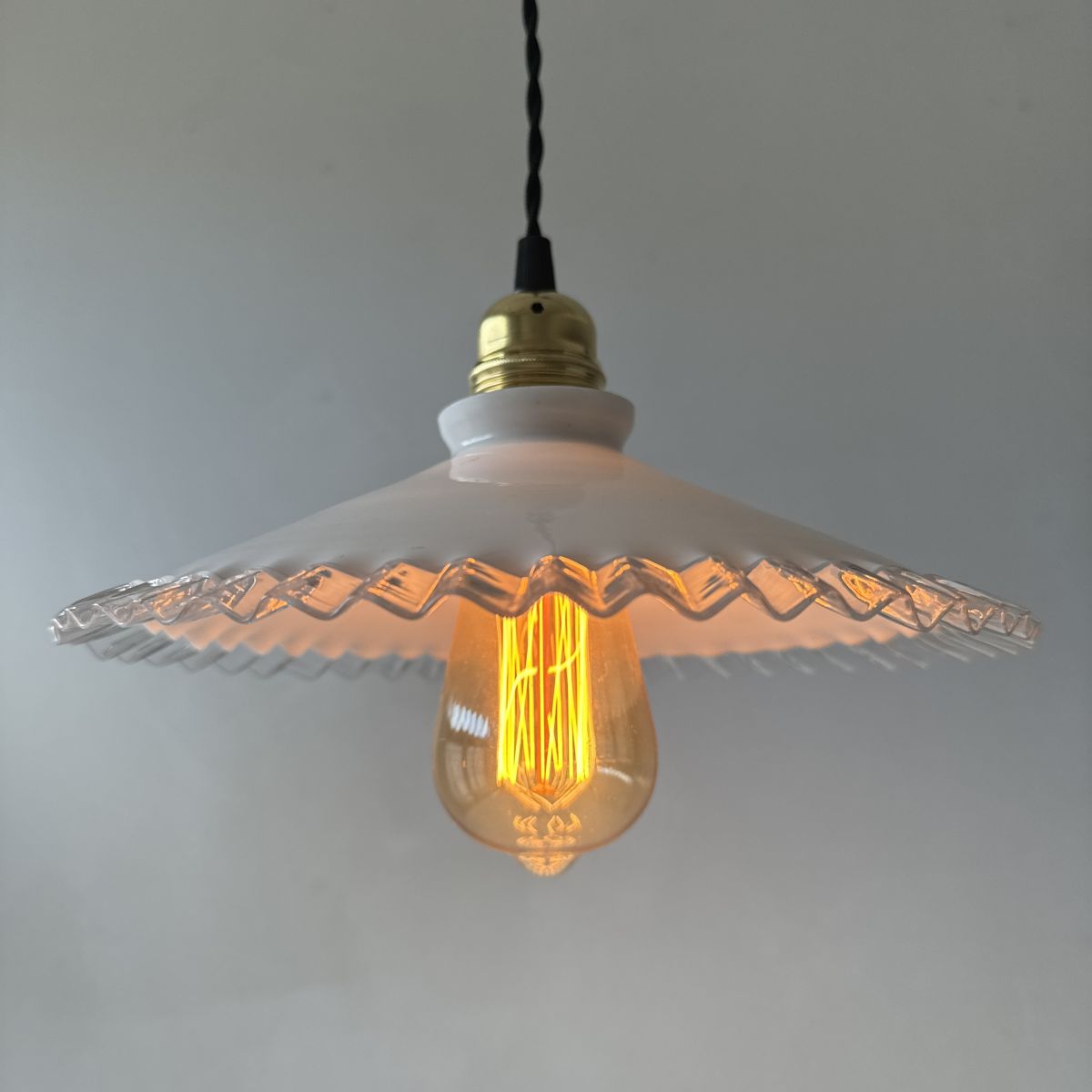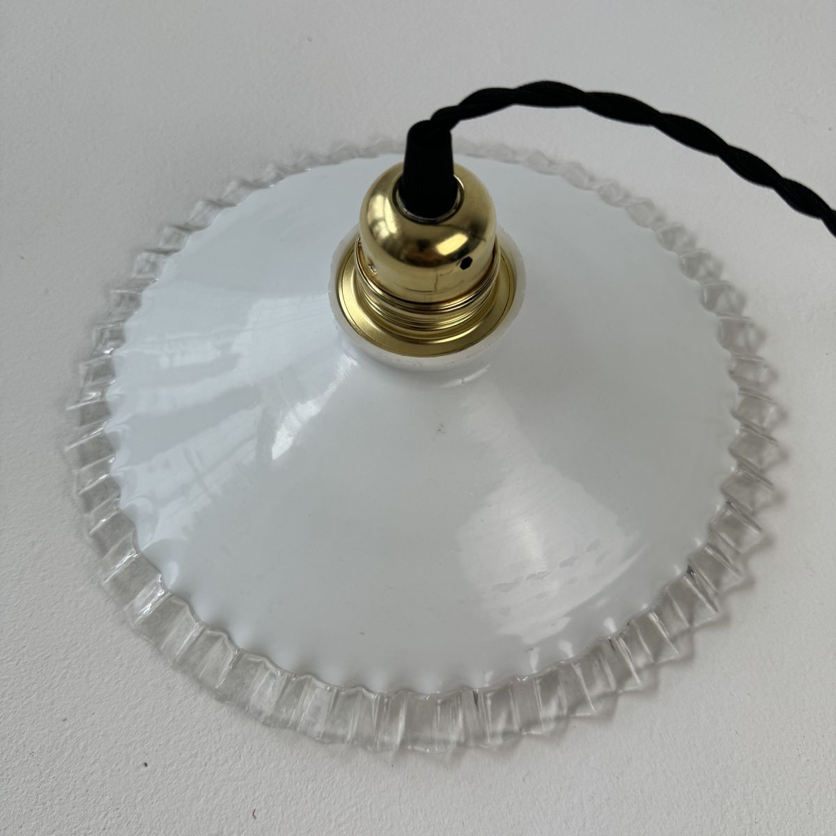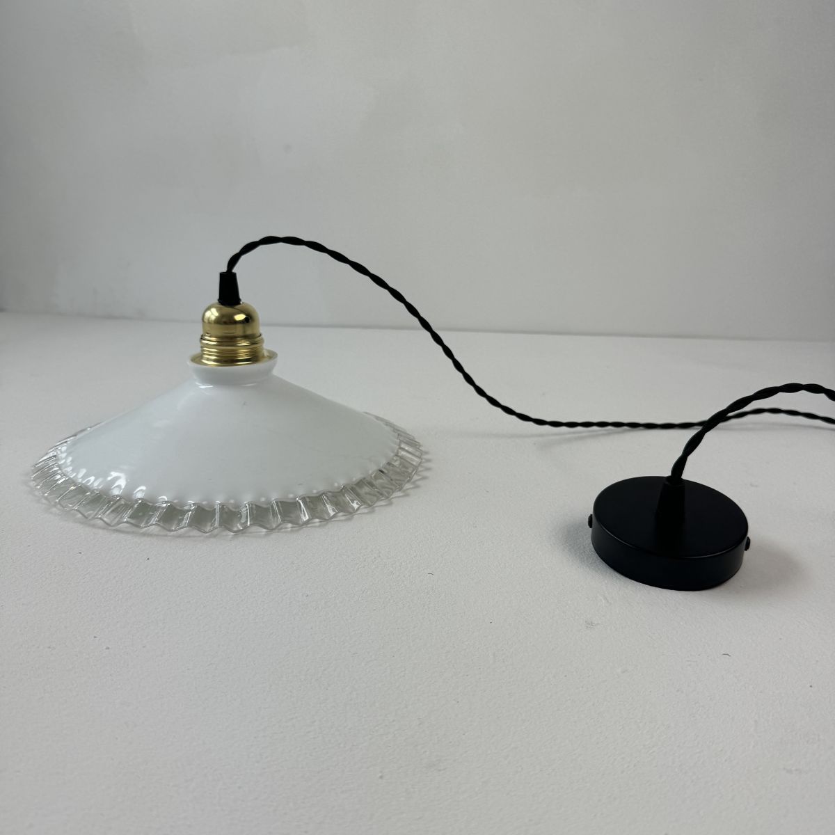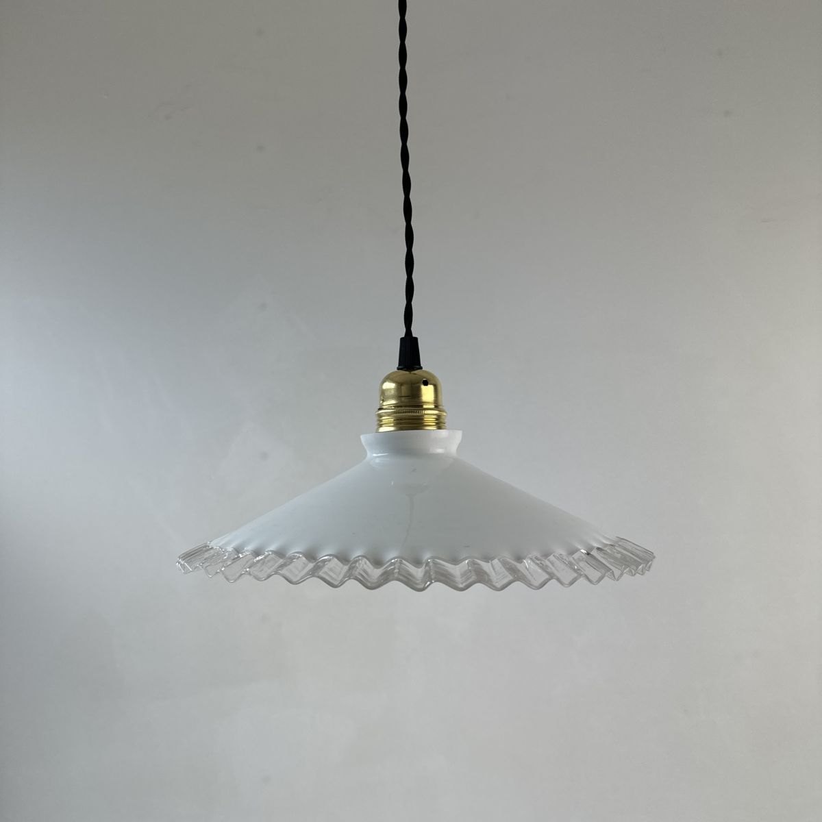 Ancienne suspension vintage en opaline dentelée. Belle lumière. Quelques traces du temps.