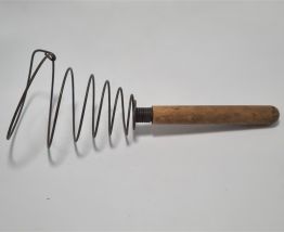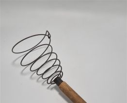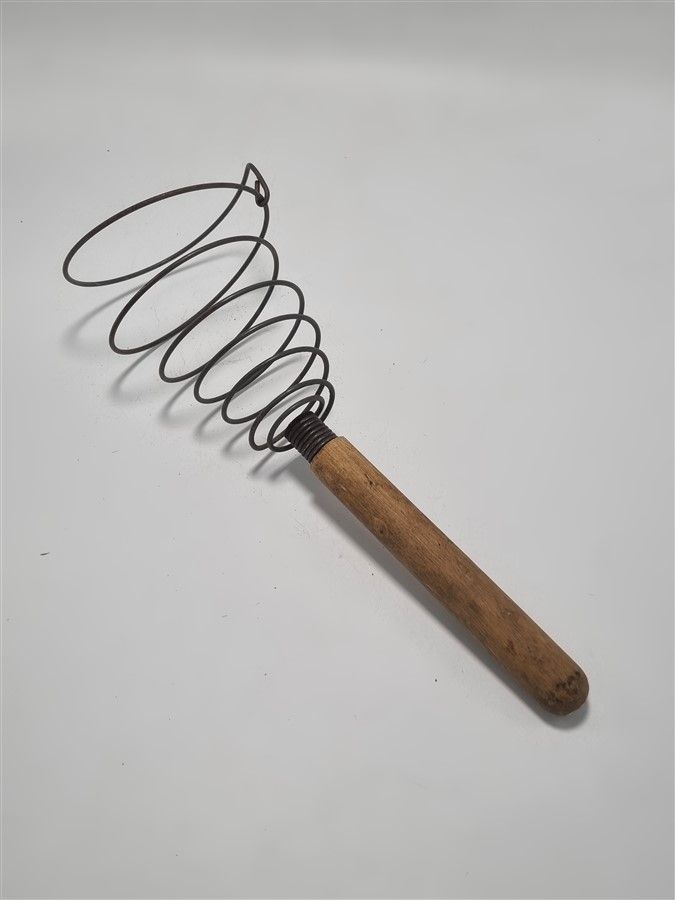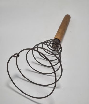 Ancien fouet de cuisine à ressort, en métal et manche en bois.