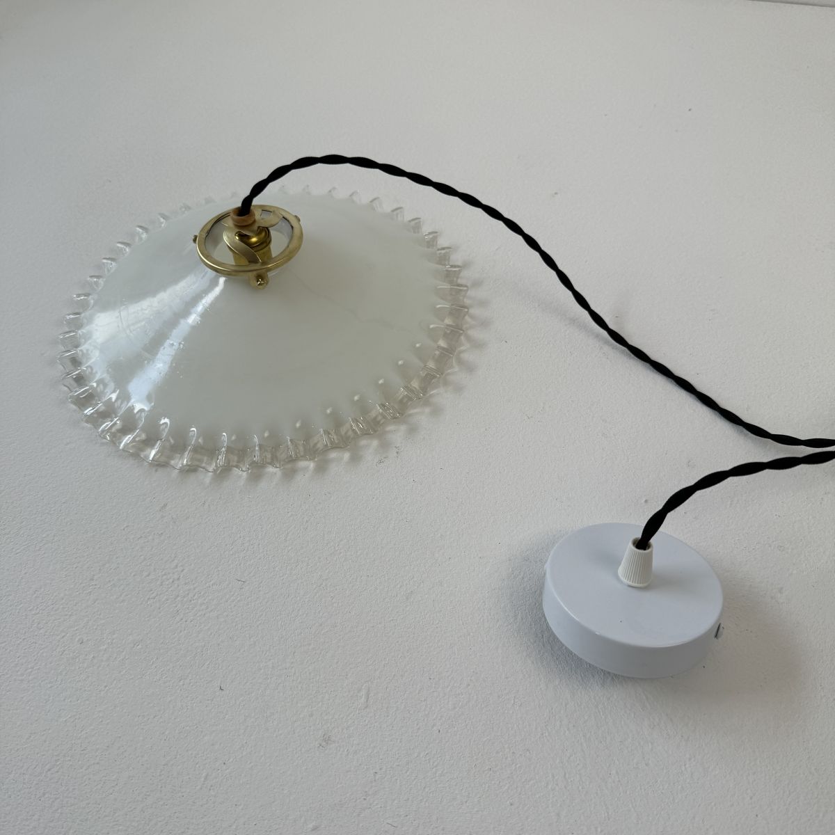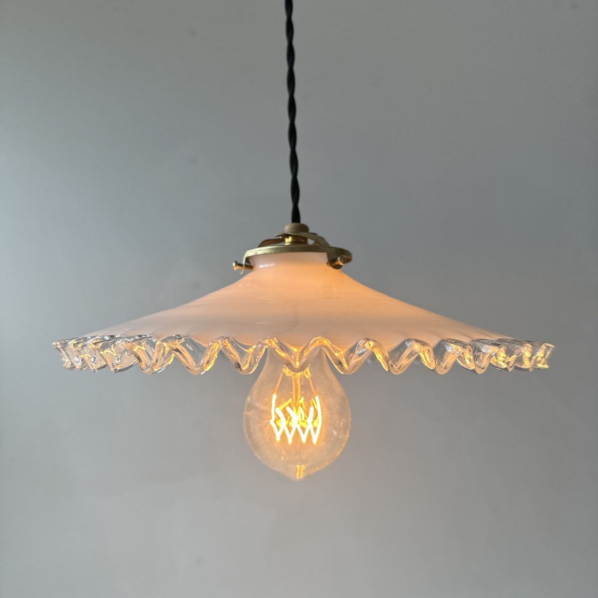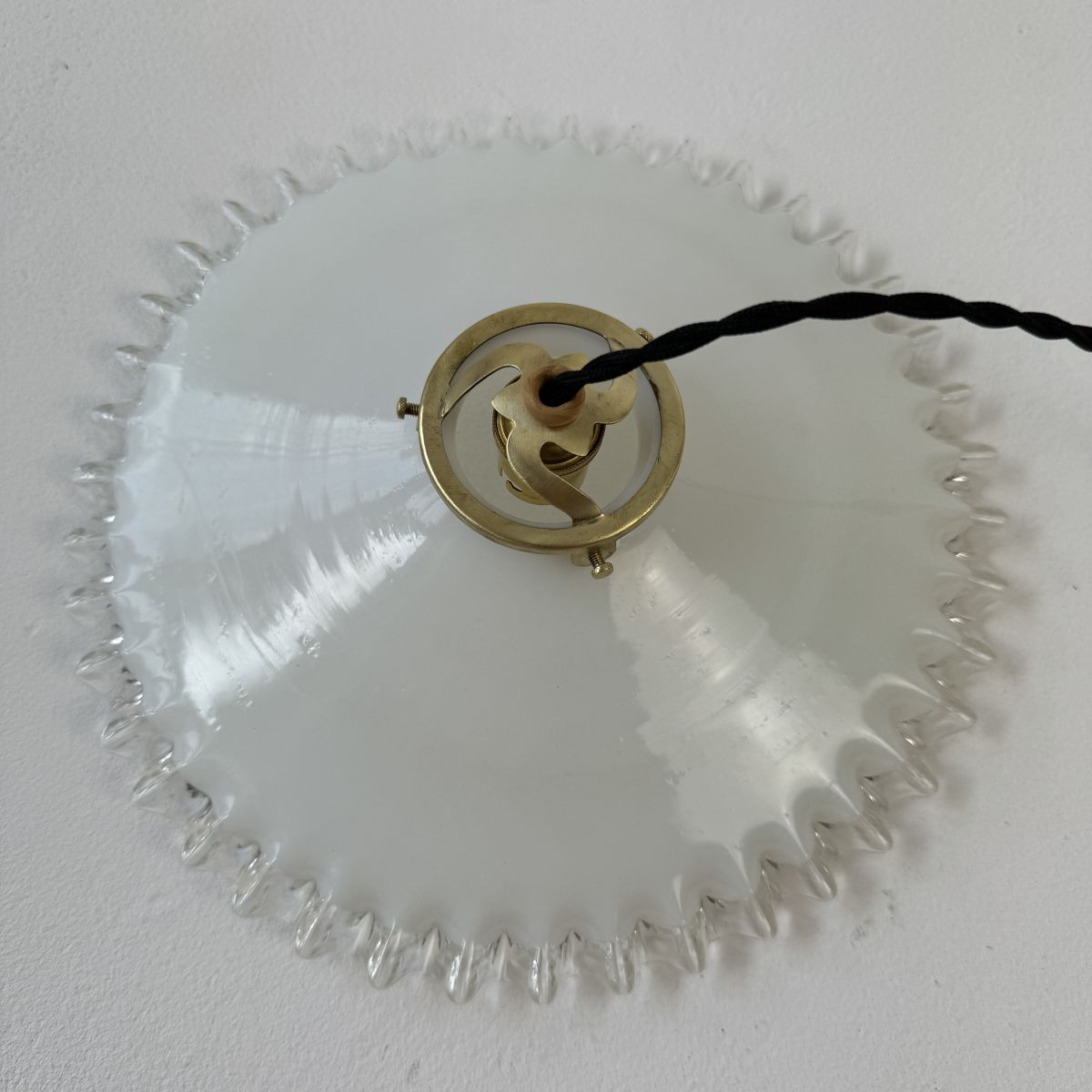 Ancienne suspension vintage en opaline dentelée. Belle lumière. Quelques traces du temps.